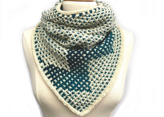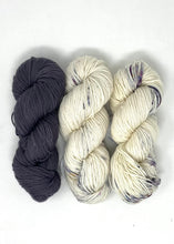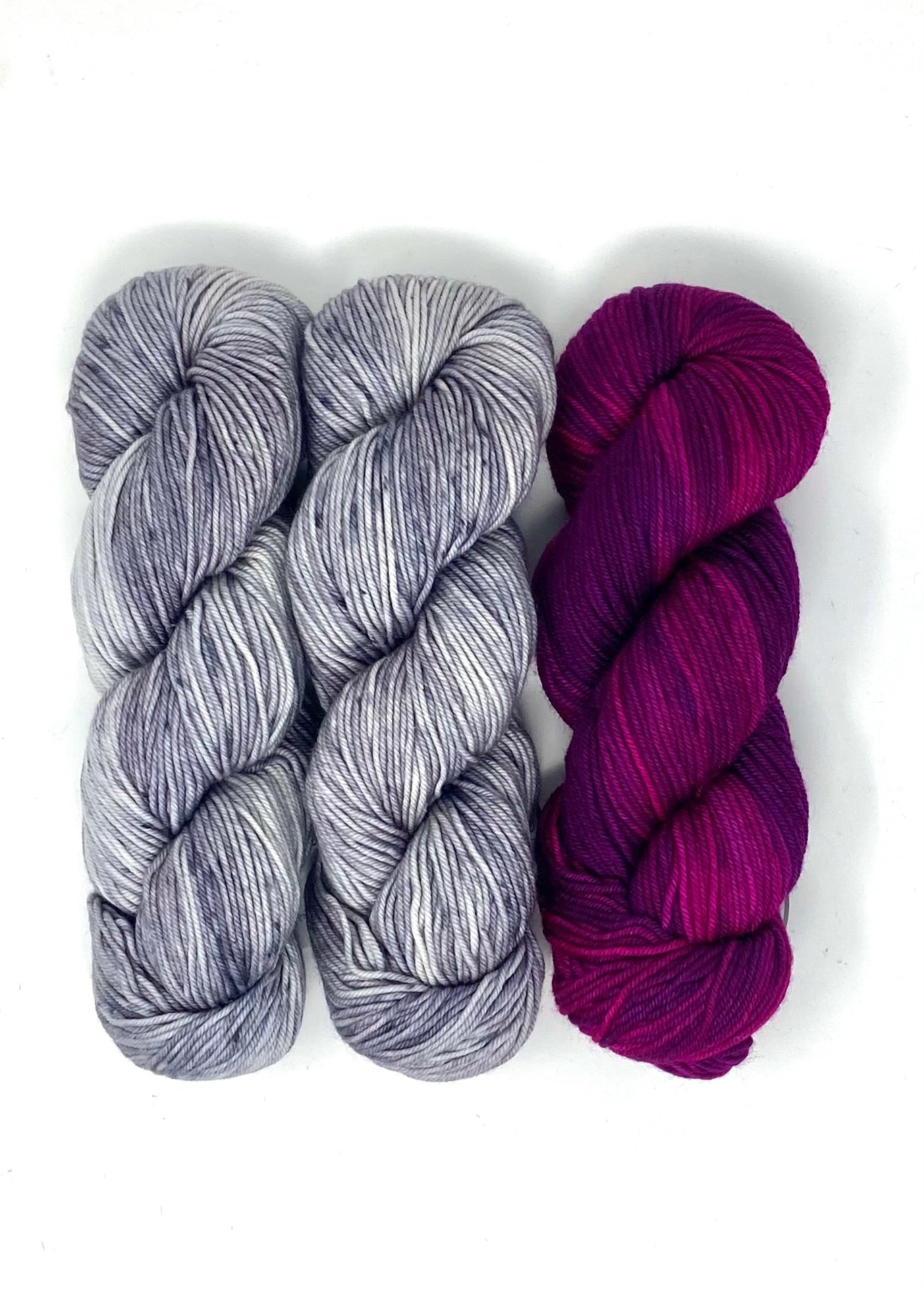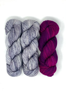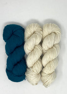 This Kentia Cowl pattern calls for two contrasting colors. These kits contain Baah Yarn Shasta, a worsted weight yarn made from 100% superwash merino wool. Each skein is carefully hand painted in the USA.