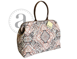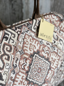 The Atenti Pioneer Bag in the pink taffy design features a intricate woven jacquard in soft pink, grey, and neutral. The opening has a 16" rectangular snap frame and is fully lined with water resistant taffeta. The inside has a zippered pocket and an open divided pocket with a mobile phone slot. The Double 12” looped straps give extra comfort. The bottom of the Atenti Pioneer bag has metal feet to protect the bag.