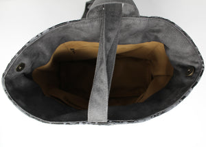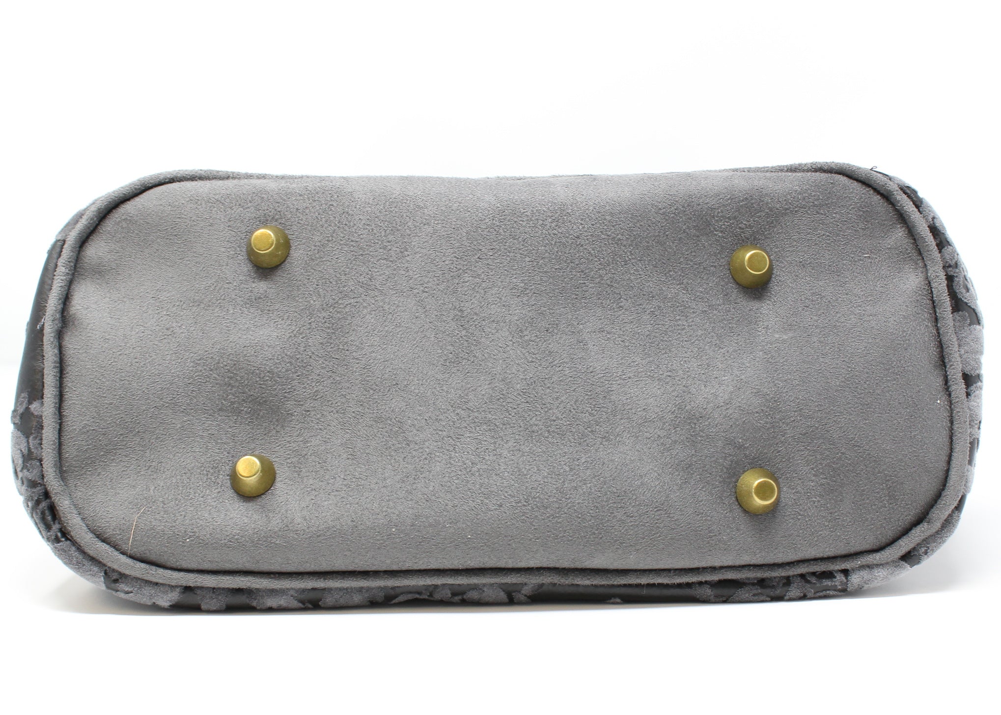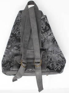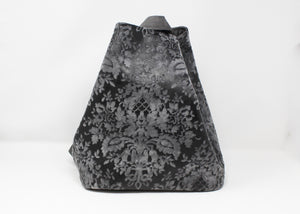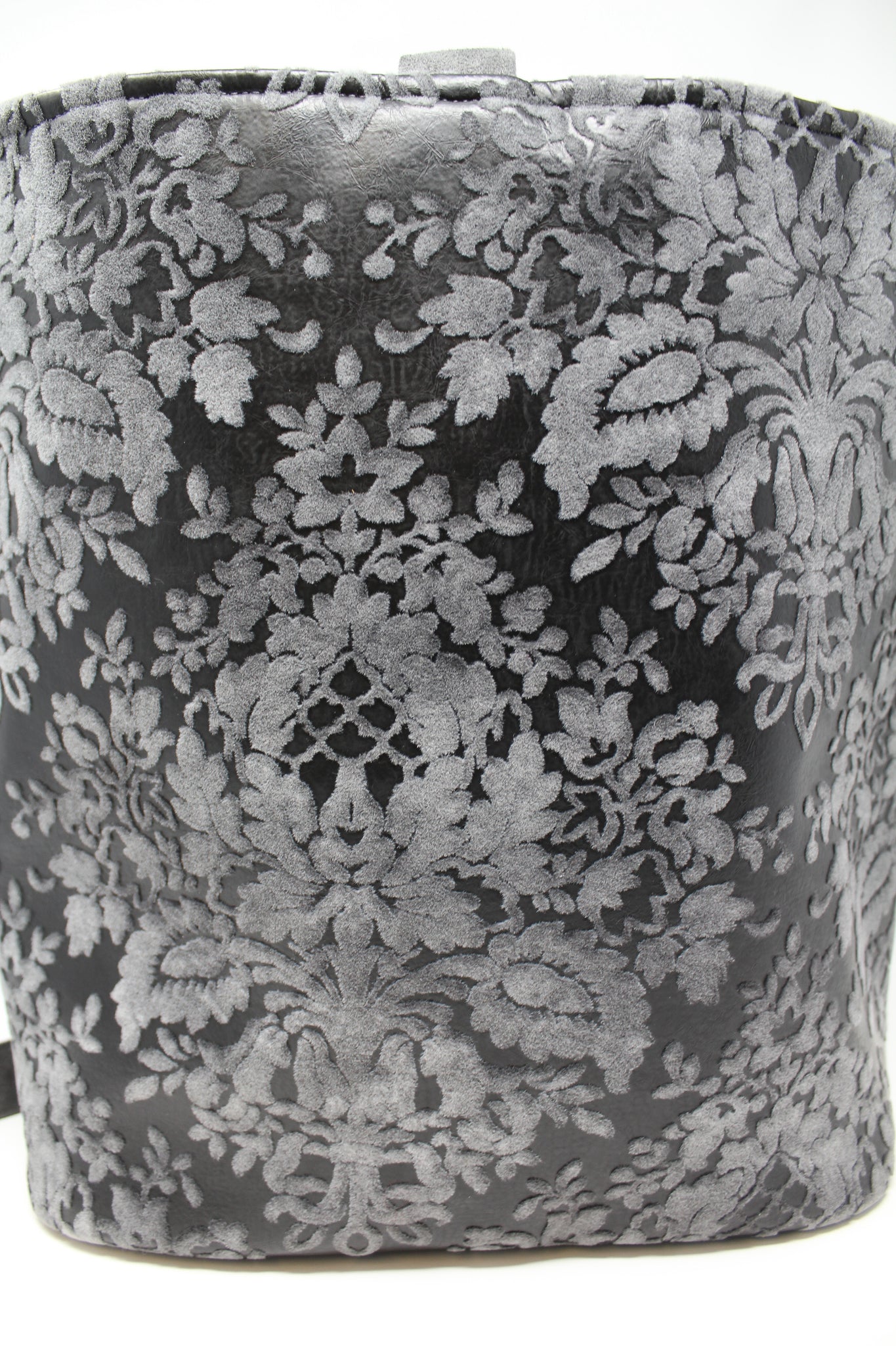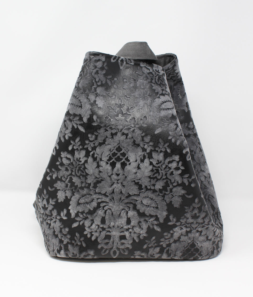 Atenti bags are made from the finest materials in Los Angeles. This charcoal Atenti Stampede backpack has a matte flocked velvety pattern on distressed faux leather. Featuring double adjustable ultra-suede straps allows this bag to be worn as a backpack, a shoulder bag, or on the wrist while knitting. The loop and internal magnet allows for the correct amount of closure. This black Atenti backpack is roomy with an oval base. Inside has a zippered pocket and a divided pocket with a mobile phone slot.