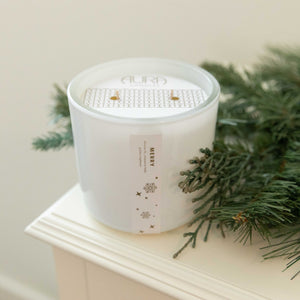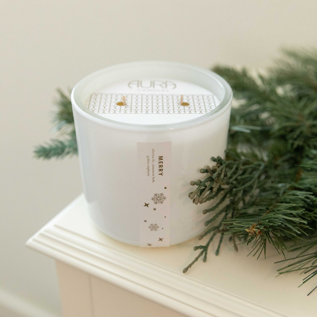 Merry - A festive holiday blend of Siberian fir, cinnamon bark, and golden raspberry. This candle will most diffidently bring in the holiday vibes! Fill your space with this warm Christmas scent candle.
