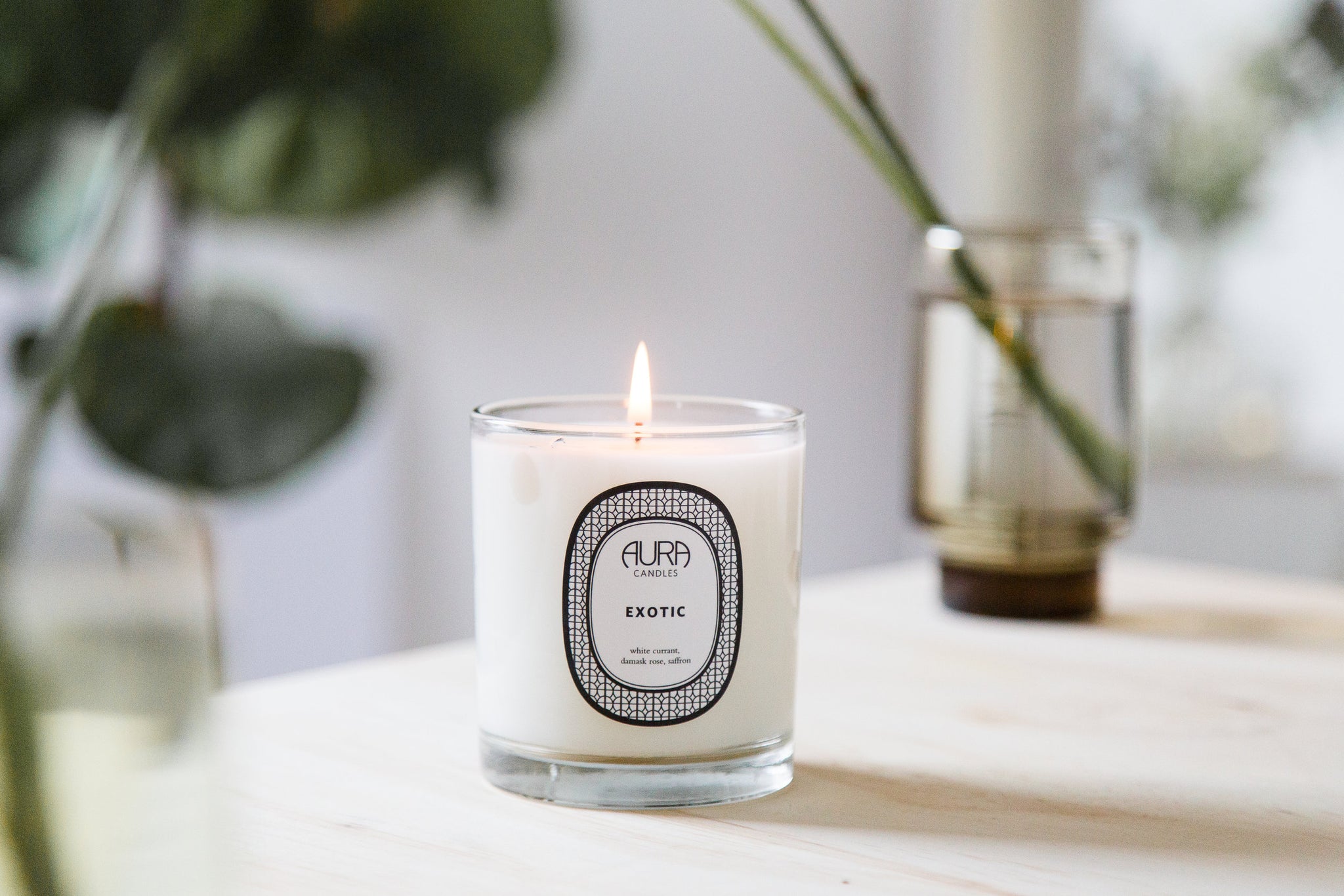A modern rose fragrance with hints of citrus and spice makes the Exotic scent a must have! This unique blend of white currant, damask rose, and saffron makes this candle unique with its striking aromas. Aura Candles are hand made in Carlsbad California. Each hand poured candle is made from a smooth coconut wax.