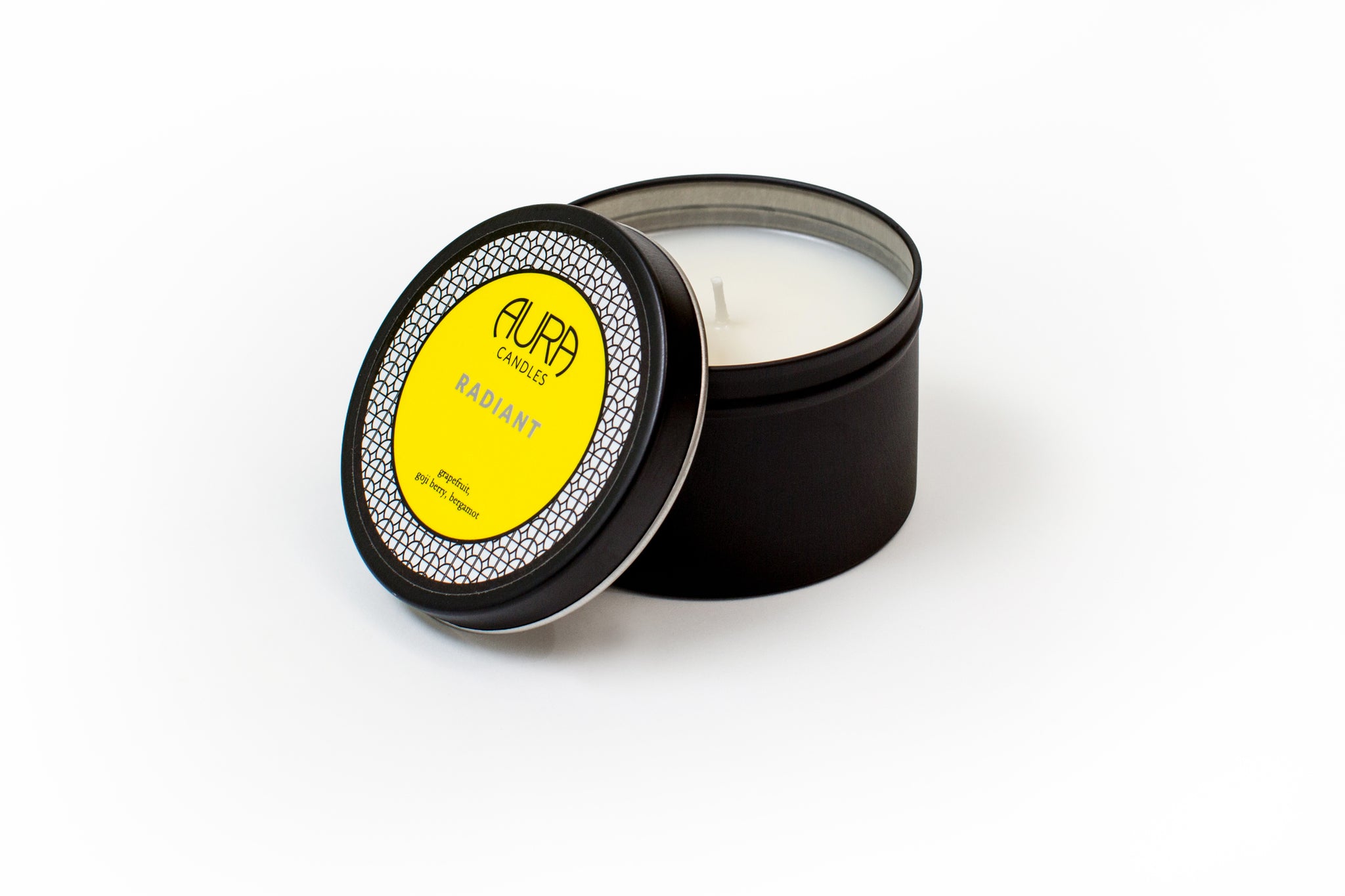 Radiant, a sensational scent of grapefruit, goji berry, and bergamot. A Wonderful balanca of of sweet and citrus. Aura Candles are hand made in Carlsbad California. Each hand poured candle is made from coconut wax.