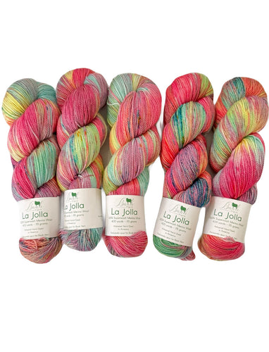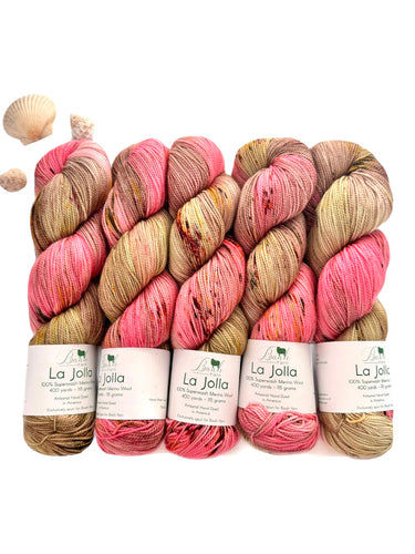 We carry quality hand dyed yarn that we hand select just for you from the Baah Yarn warehouse. Feel confident with everything you knit using Baah Yarn La Jolla yarn colors. Baah Yarn La Jolla is hand painted in the USA and is made from 100% superwash merino wool. Each skein of Baah La Jolla yarn is 400 yards and is 115 grams. This 2 ply fingering weight yarn is perfect for knitting socks, shawls and more! It has an excellent one of a kind twist to make your knitting experience enjoyable. Baah La Jolla yarn is also available in Baah Yarn exclusive monthly colors. If you do not see the right color for you, email info@thelovinashop.com to place a custom order for Baah Yarn La Jolla.