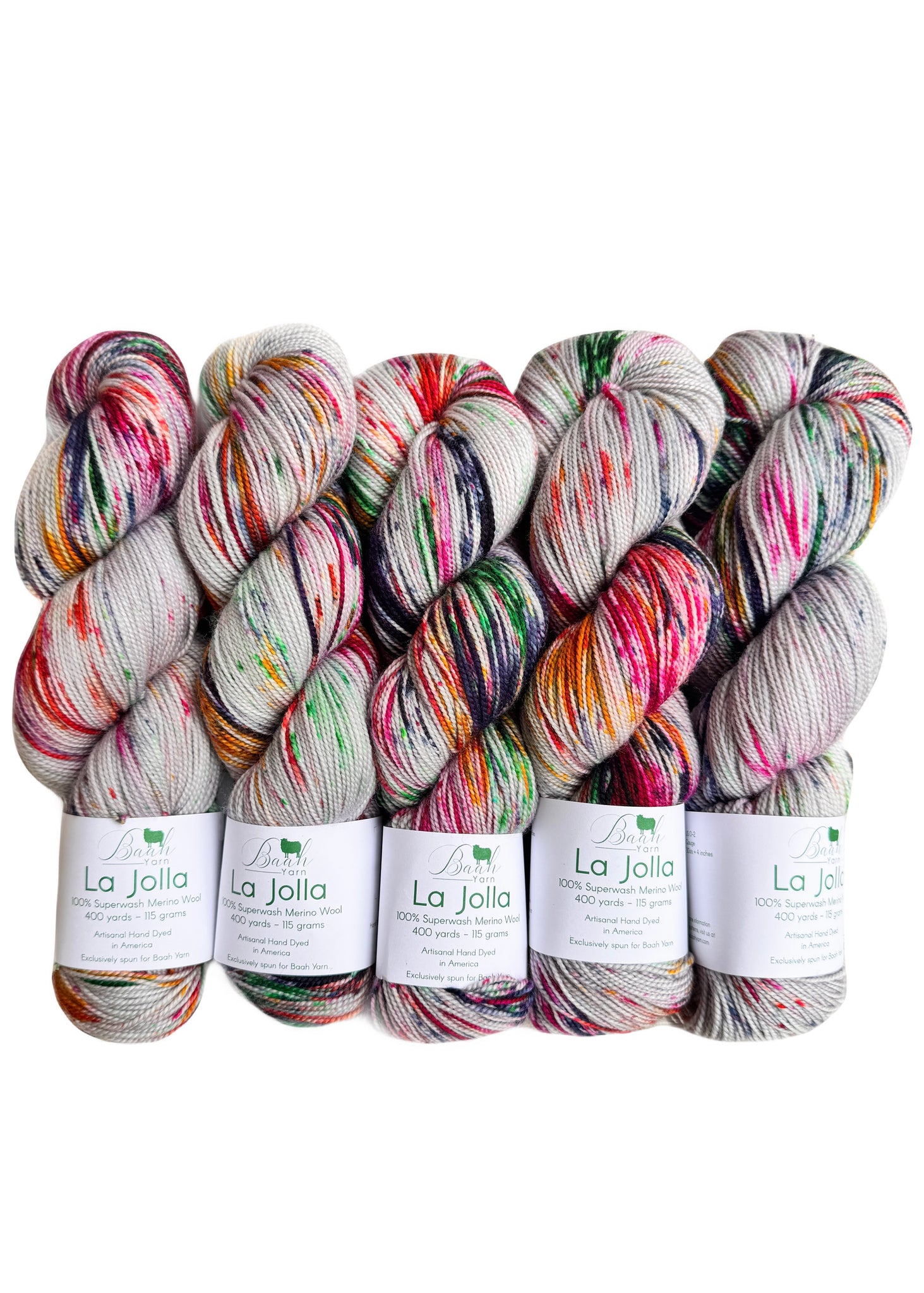 This color called Star Studded in Baah La Jolla has a soft, light gray base scattered with fun pops of magenta, ruby red, golden amber, deep navy, and fresh green. The playful bursts of color bring energy and warmth to the skein, creating a lively, expressive look that still feels balanced and cohesive.