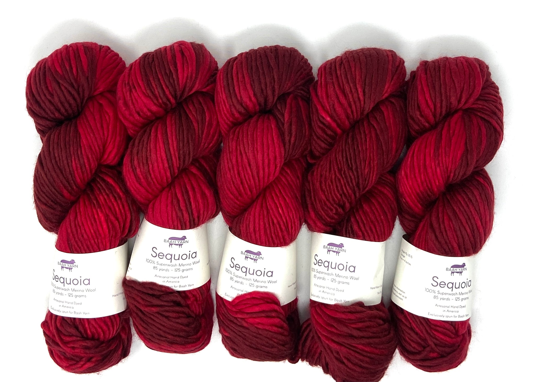 Baah Yarn is hand-dyed in the USA. The Sequoia yarn line is made from 100% superwash merino wool.
