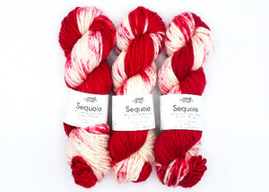 This limited color Peppermint Bark has a fabulous combination of red and white and is part of Baah's Dipped and Dappled series. The Dipped and Dappled series is great to use with self striping patterns. The Sequoia yarn is super bulky and is made from 100% superwash merino wool. This Christmas variegated yarn color knits up wonderfully with the Chain Link Hat pattern