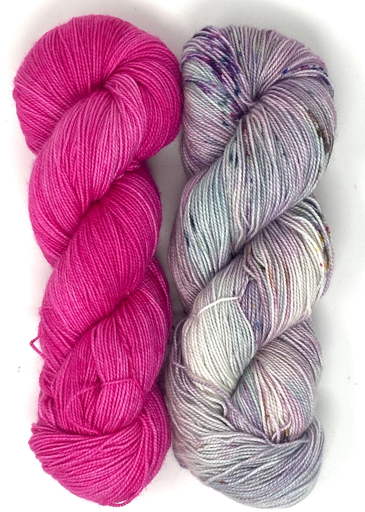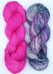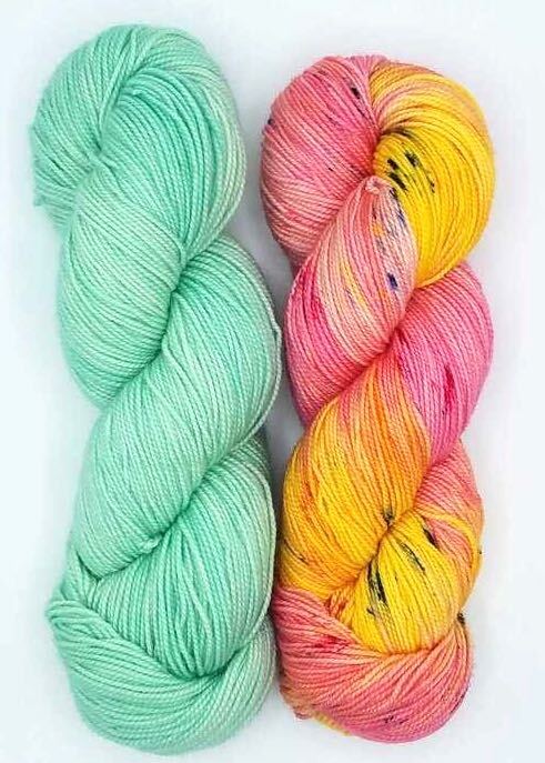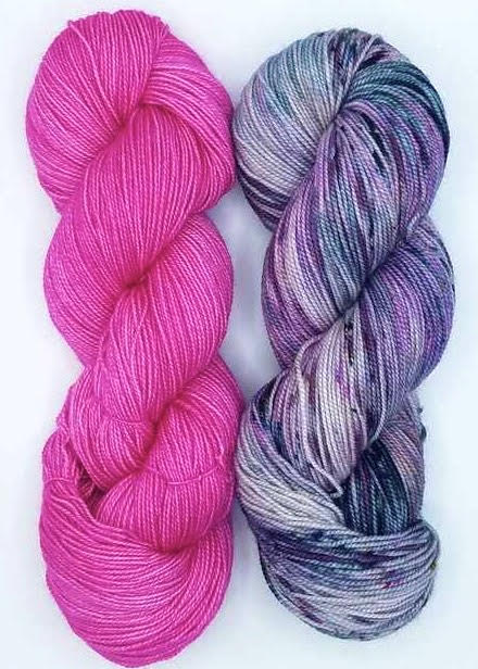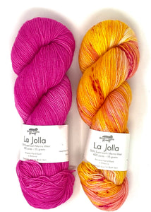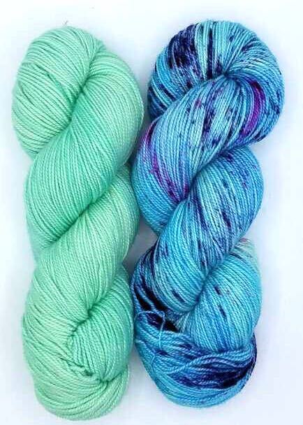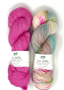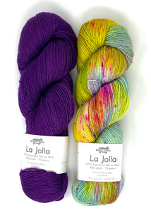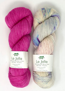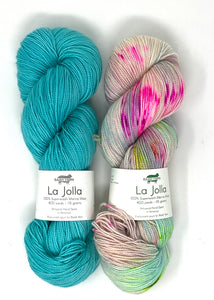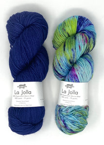Hug Shot Kits include La Jolla yarn 100% superwash merino wool that is beautifully hand dyed from Baah. Each Hug Shot kit comes with solid and variegated/speckled La Jolla yarn colors. Each skein of Baah Yarn La Jolla is 400 yards, fingering weight, and 2 ply. Savannah yarn can also be used, 80% superwash merino, 10% cashmere, 10% nylon, fingering weight. Savannah yarn base will give your shawl a little more drape.