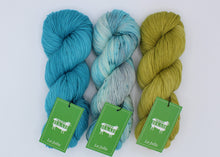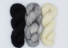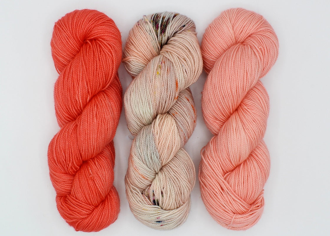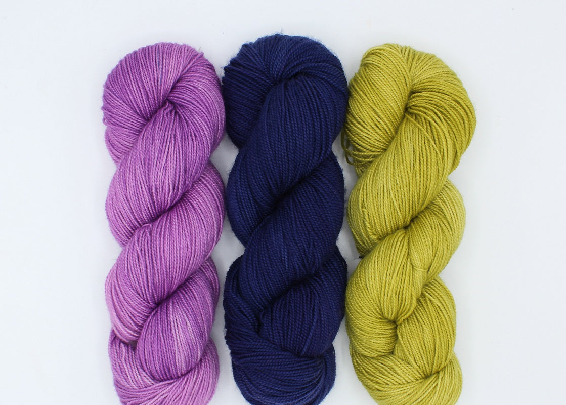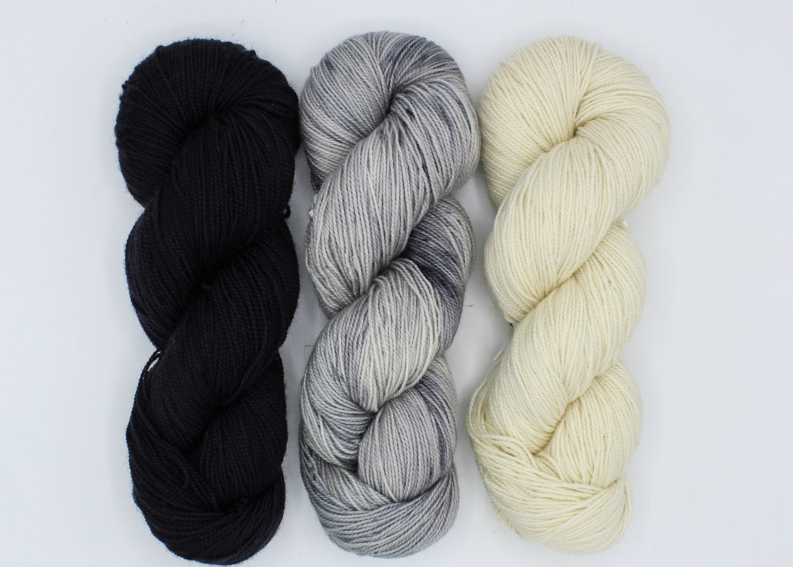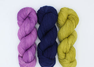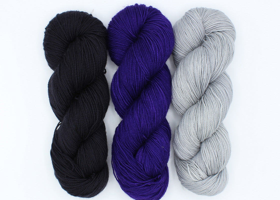 Each kit comes with 3 skeins of Baah Yarn La Jolla, a fingering weight yarn made from 100% superwash merino wool. Each skein is 400 yards and is hand-painted in the USA.