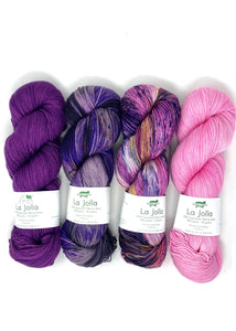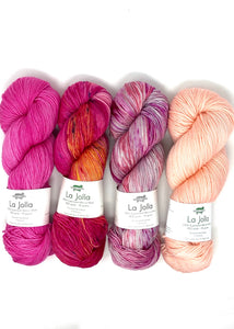 There are so many possibilities with this kit! Get two cowls out of one kit. Mix up your colors and have a semi matching cowl, gift one to a loved one for the holidays, or keep an extra for yourself! Each Secret Handshake kit comes with 4 skeins of Baah Yarn La Jolla. La Jolla is fingering weight, made from 100% superwash merino wool. Each hand dyed skein is 400 yards.