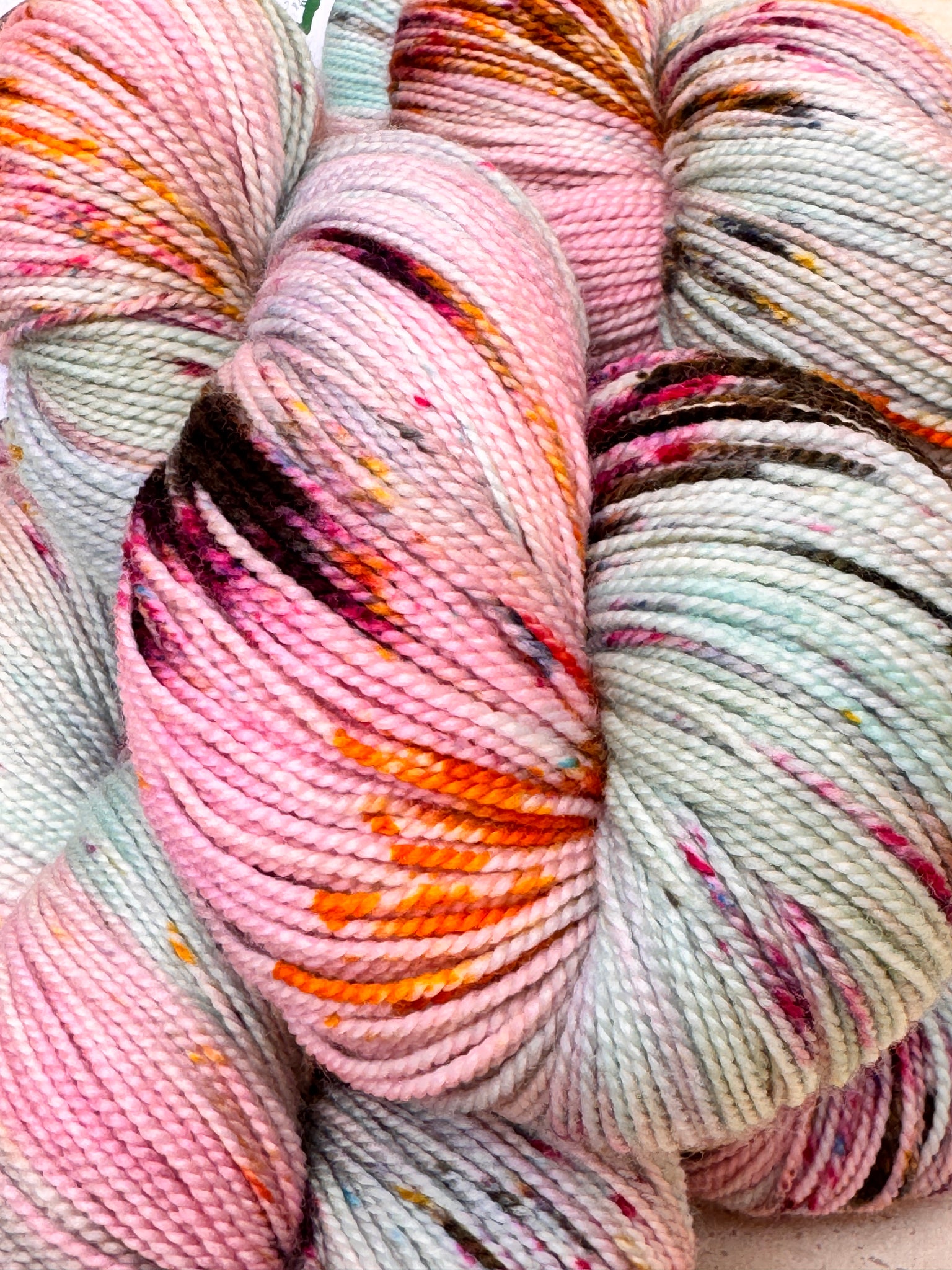 Apples to Oranges has a soft blush and minty sea-glass tone with bursts of tangerine and golden apricot.