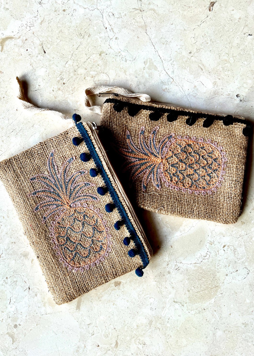 This wristlet features a black pineapple print on raffia. It has a zipper on top and is great for storing project accessories, knitting needles, and small projects. Hand made in Bali using natural materials.