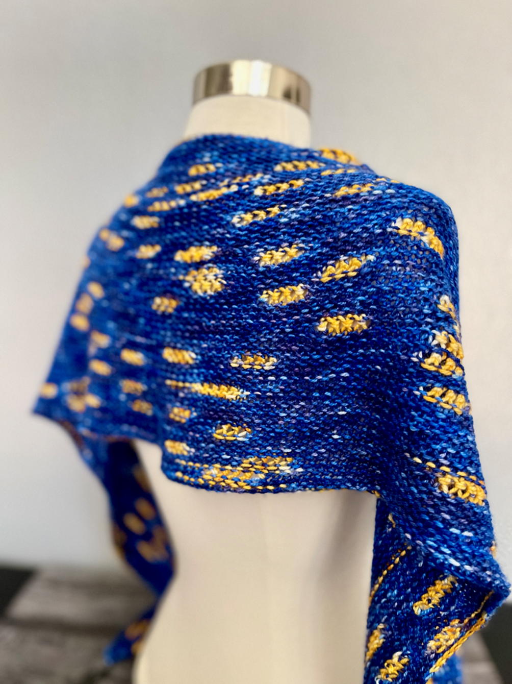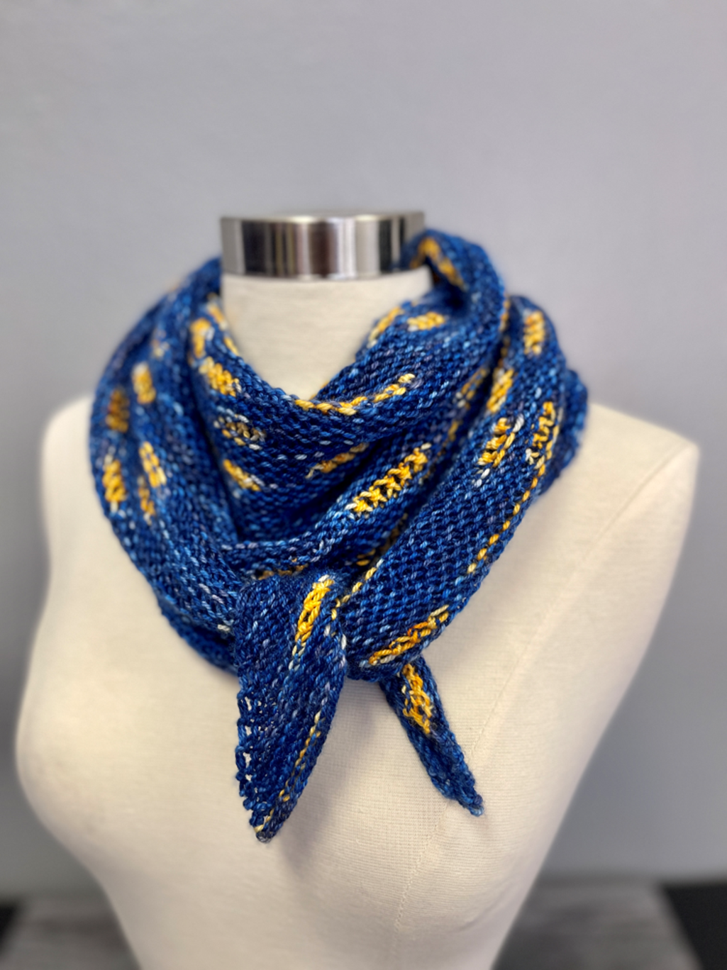 This shawl uses 1 skein of yarn with an assigned color pooling color. This easy and fun knit is great for any level.