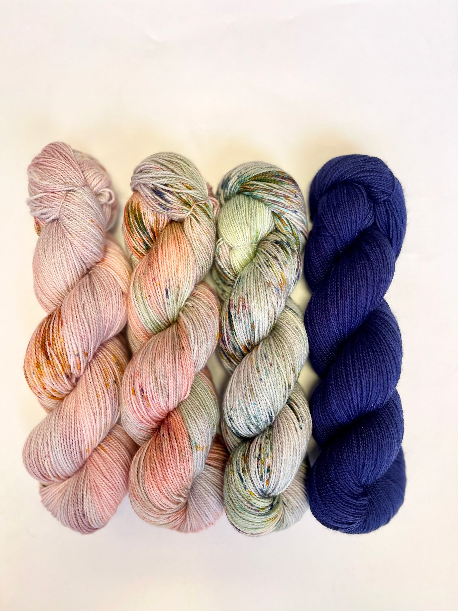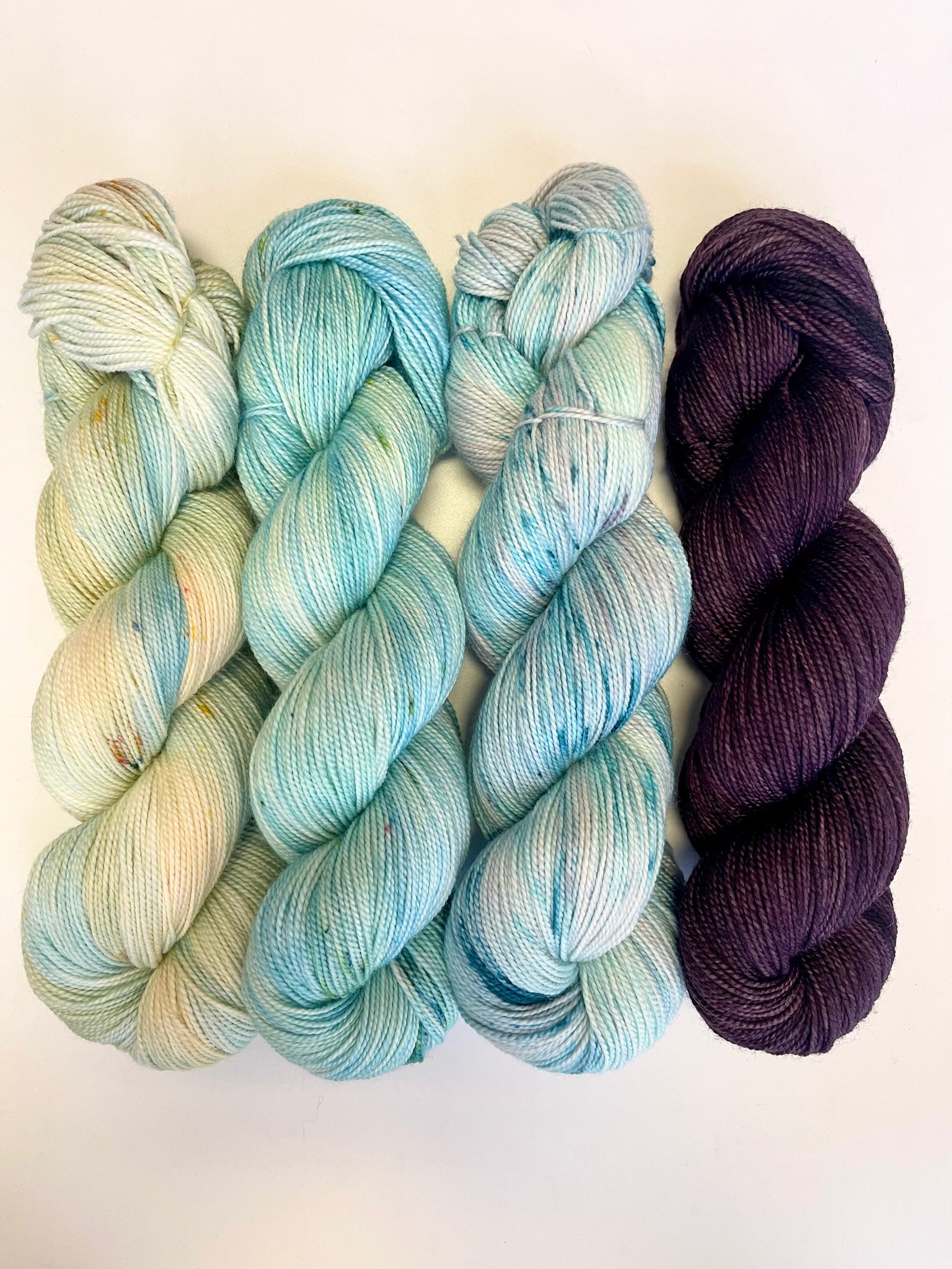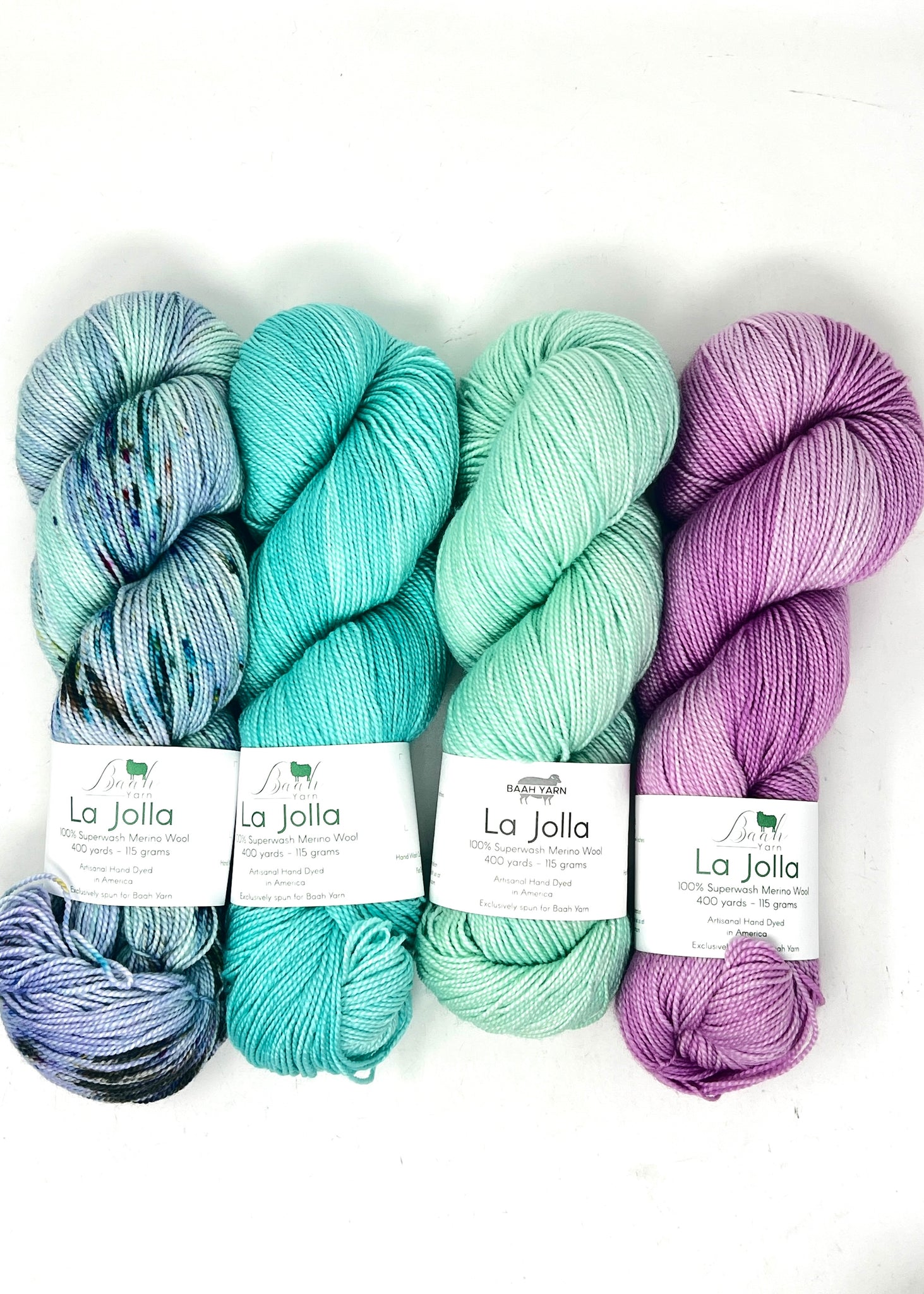 This summer MKAL starts July 22, 2023. Will ship usps priority mail (2-3 day shipping) These 4 skein kits were made using Baah Yarn La Jolla. This fingering weight yarn is hand dyed and is 400 yards a skein. Made from 100% superwash merino wool, this yarn is a joy to knit with.