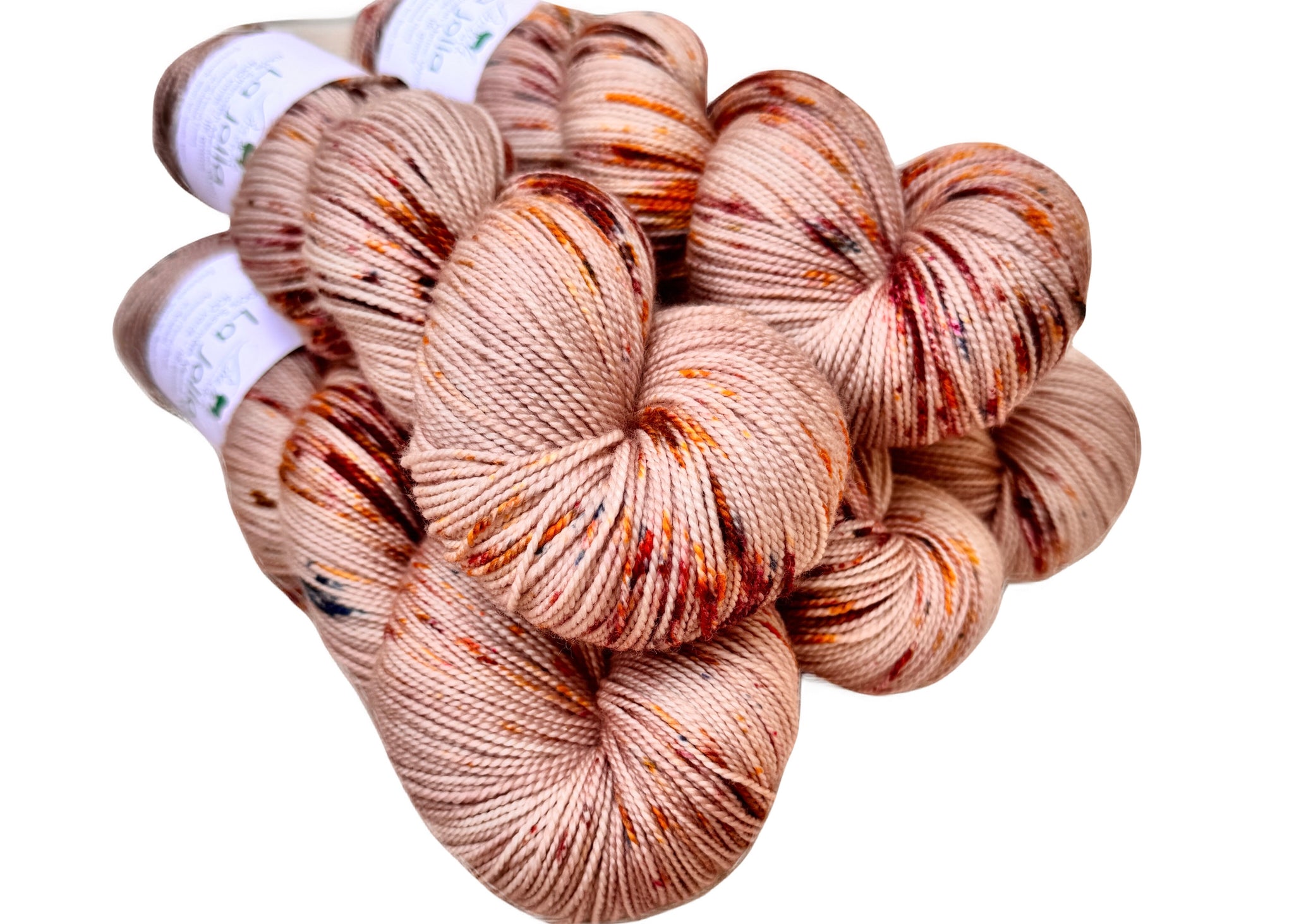 A delicate blush ground, kissed with freckled pops of rust, golden ochre, deep plum and slate blue. Reminiscent of early morning light dancing through petals, this speckled beauty brings subtle depth and playful contrast to every stitch.