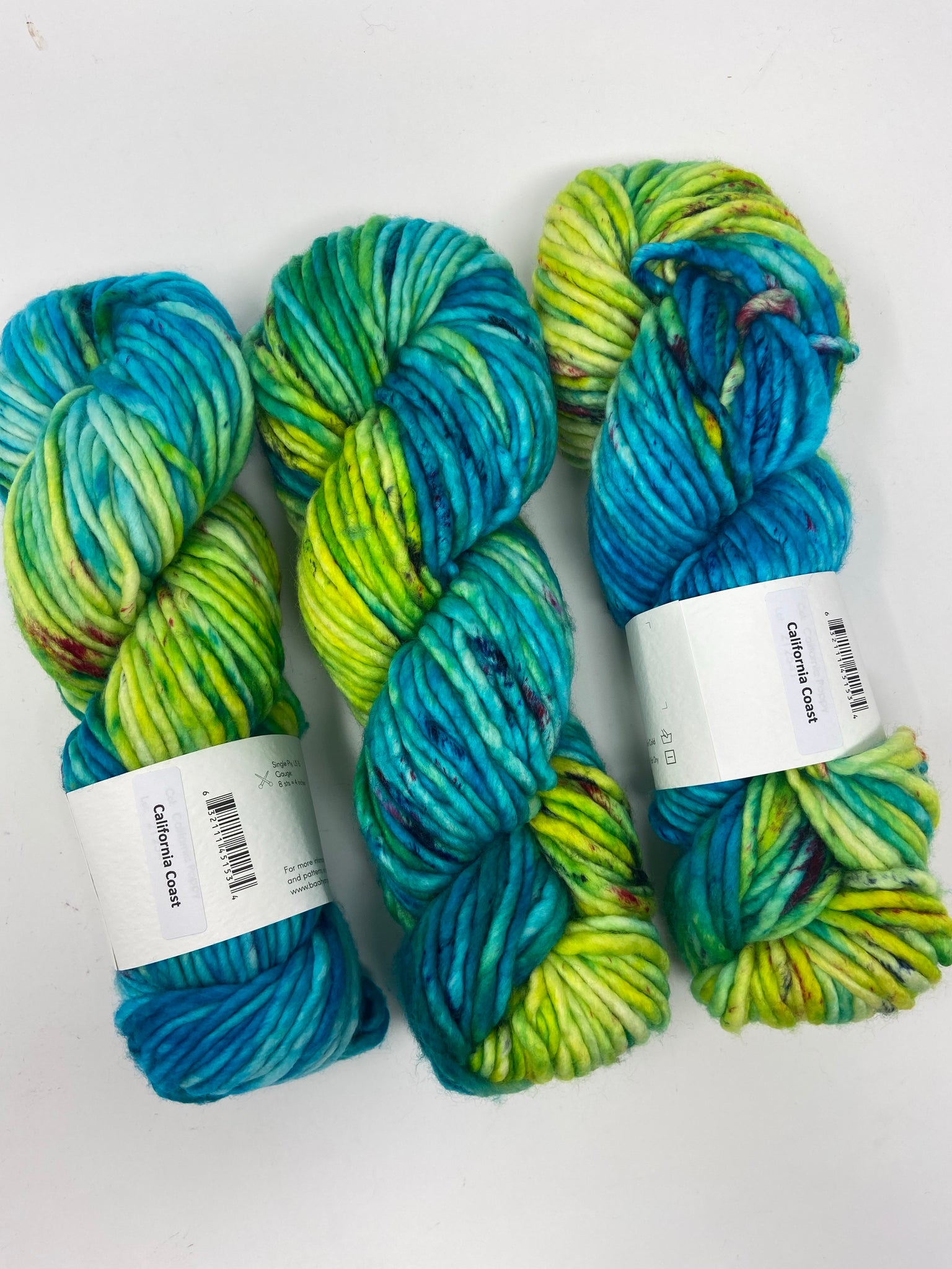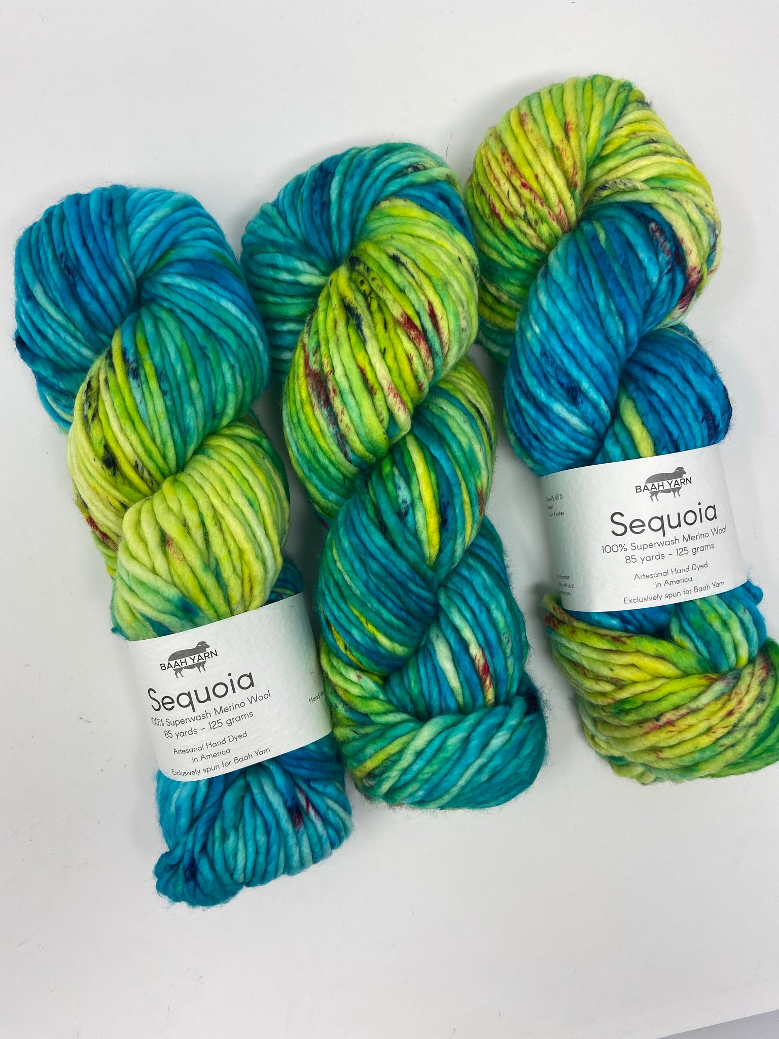Baah Yarn Sequoia is a super bulky yarn hand painted in Southern California. Baah Yarn Sequoia California Coast features bright blue and green tones and is perfect for projects that you want to complete quickly.