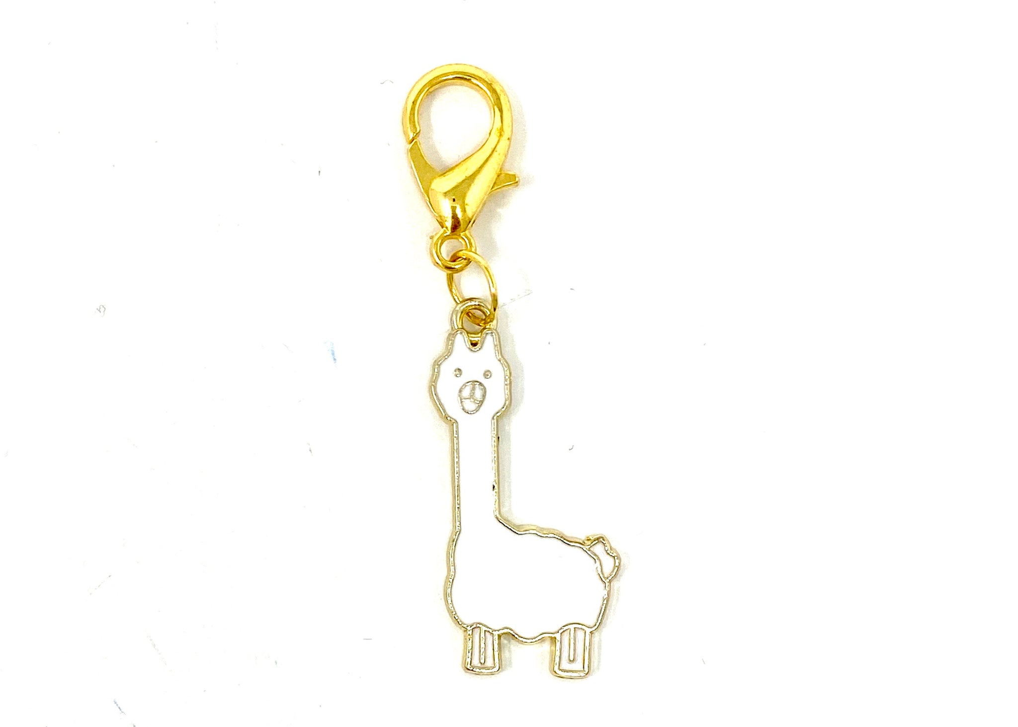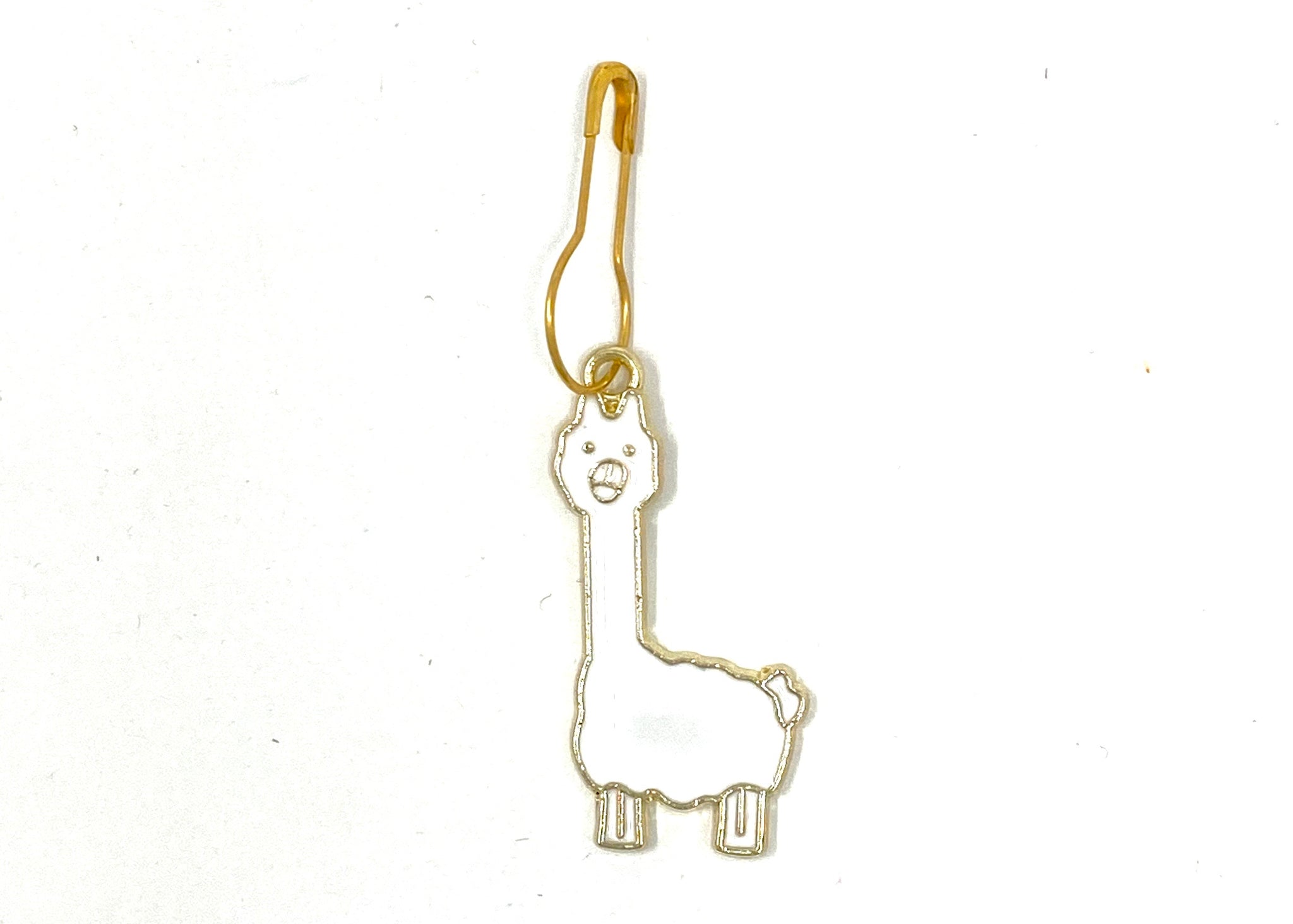 This Alpaca stitch marker has a lobster claw or safety pin option. Featuring a gold outline and a bright white alpaca. This stitch marker is a must have for any knitter!