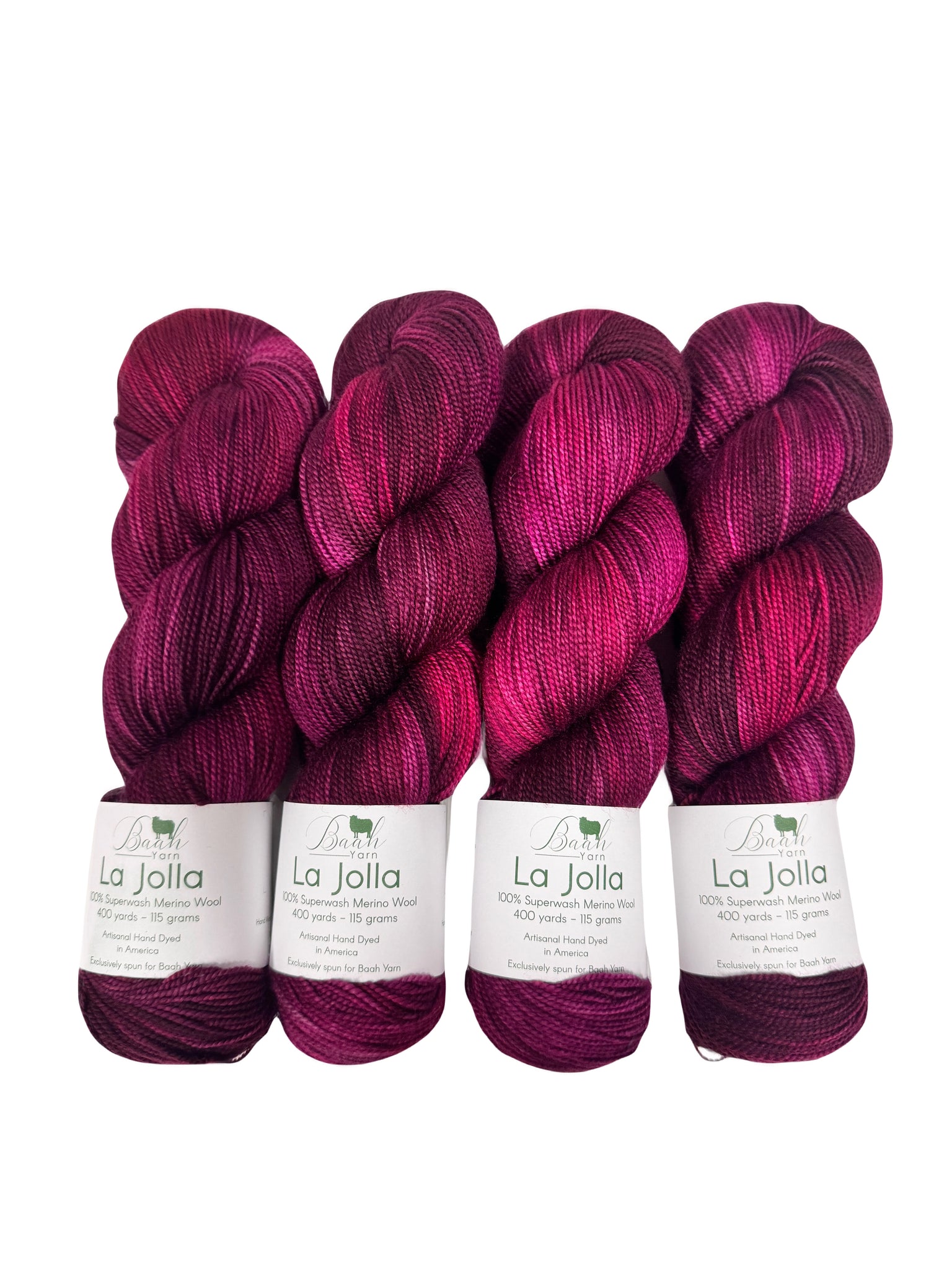 Baah Yarn La Jolla is a fingering weight yarn made from 100% superwash merino wool. Each skein is hand dyed in the USA.