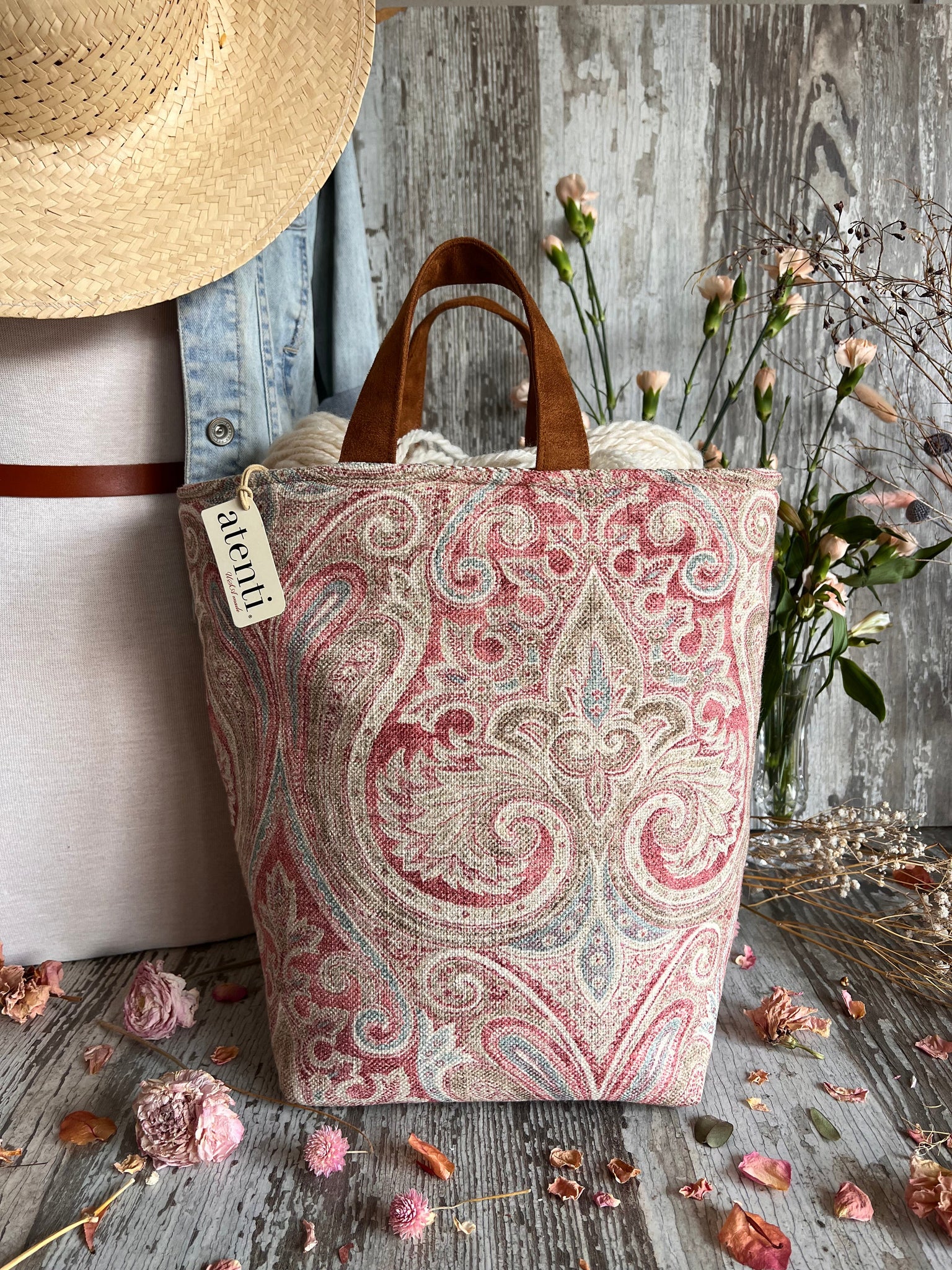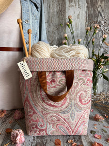 This project bag is nice and roomy! It features a warm paisley tone pattern. The top rolls down for easy project access with a wide opening with two handles. Each Atenti project bag is fully lined with their water repellent taffeta and contains 3 inside pockets.