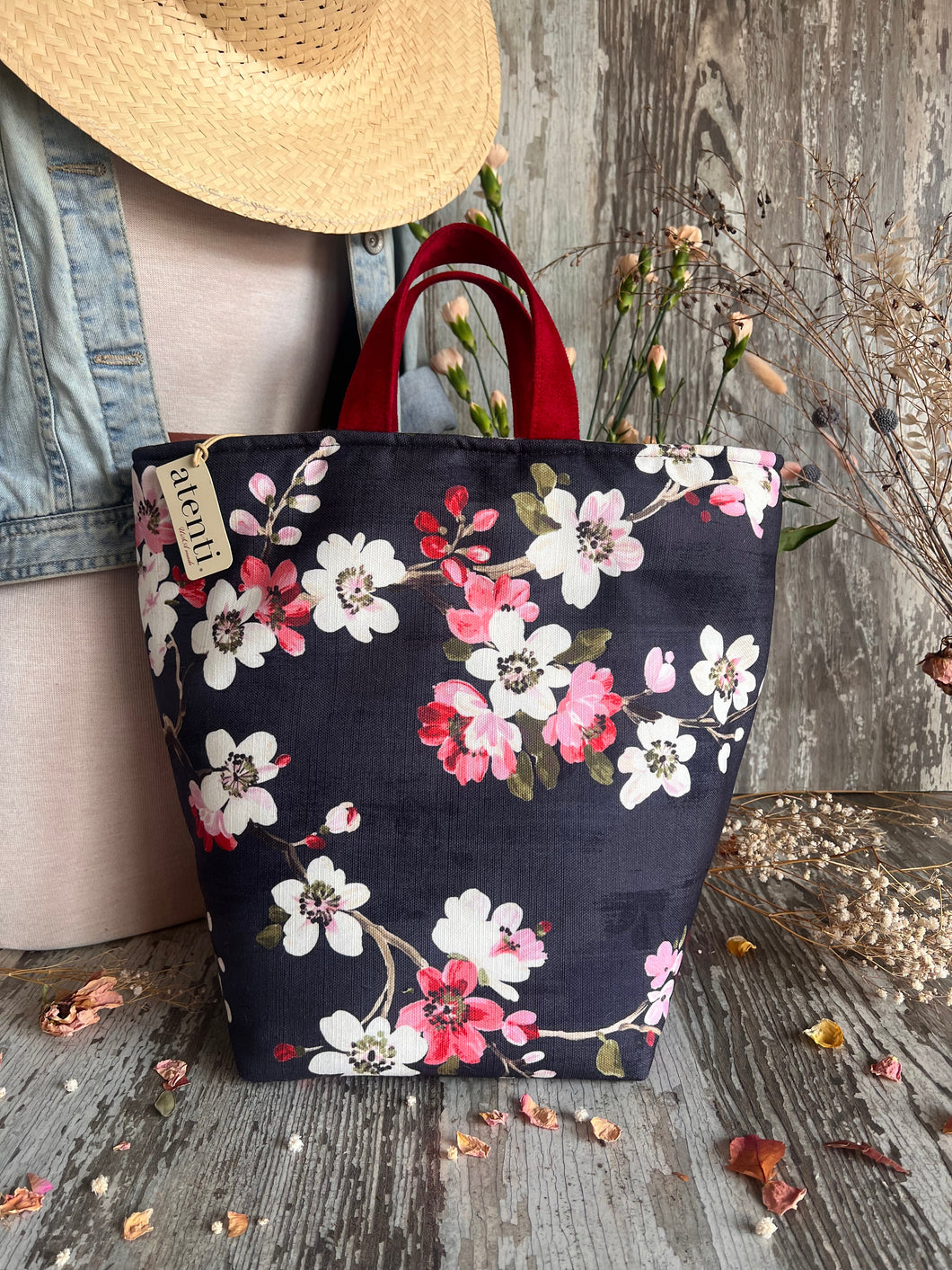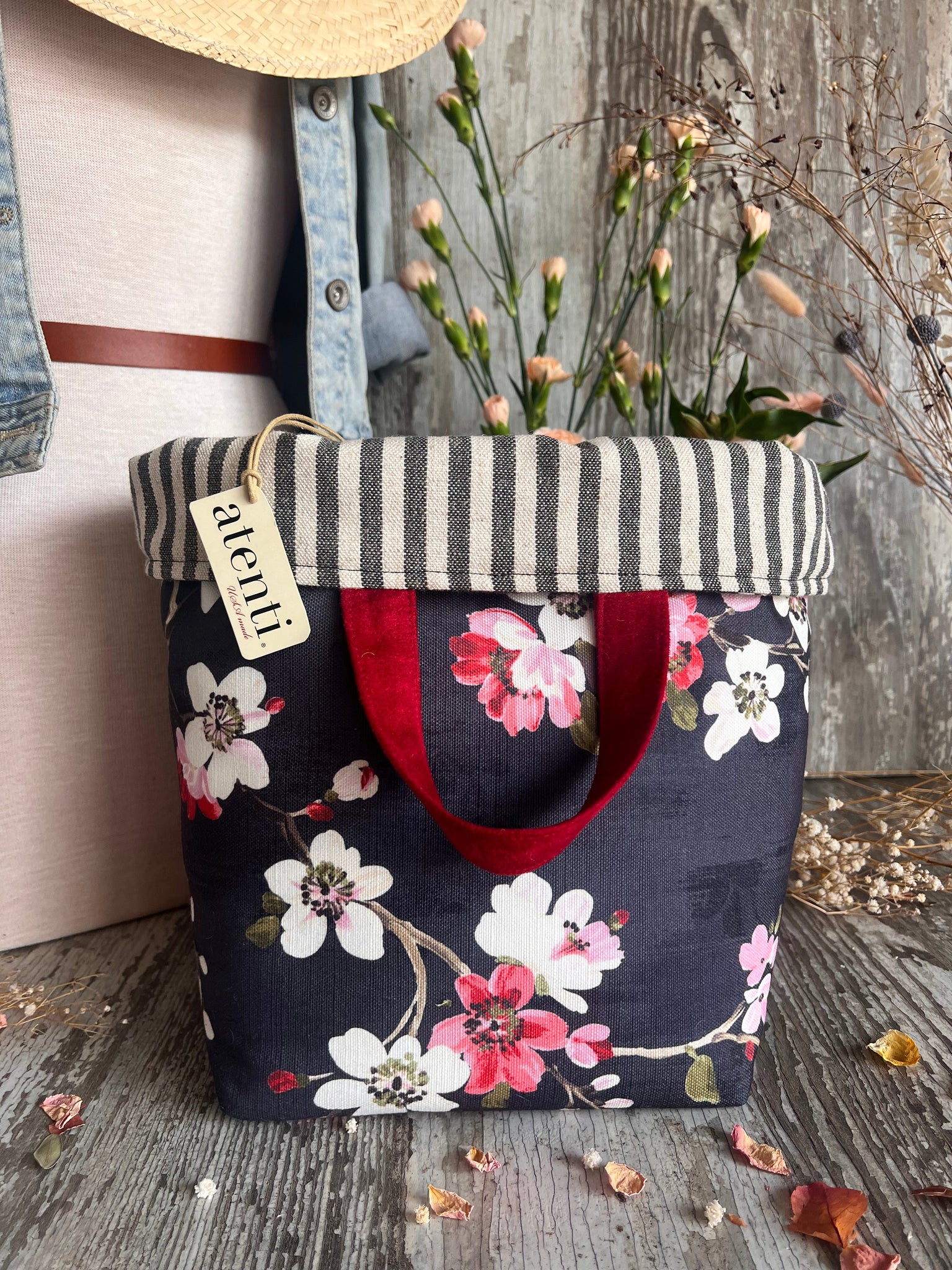 This project bag is nice and roomy! It features a printed cherry blossom pattern. The top rolls down for easy project access with a wide opening with two handles. Each Atenti project bag is fully lined with their water repellent taffeta and contains 3 inside pockets.