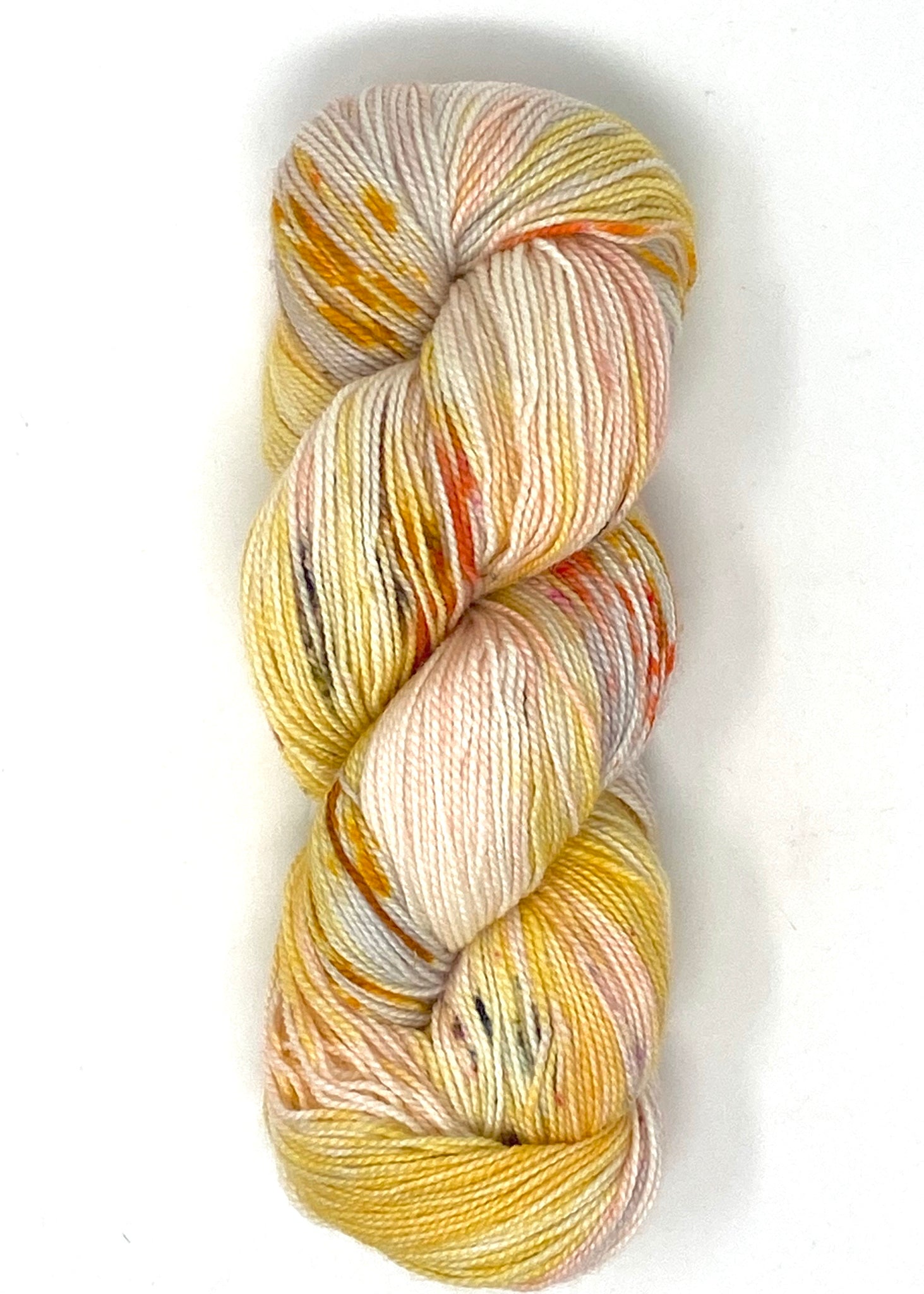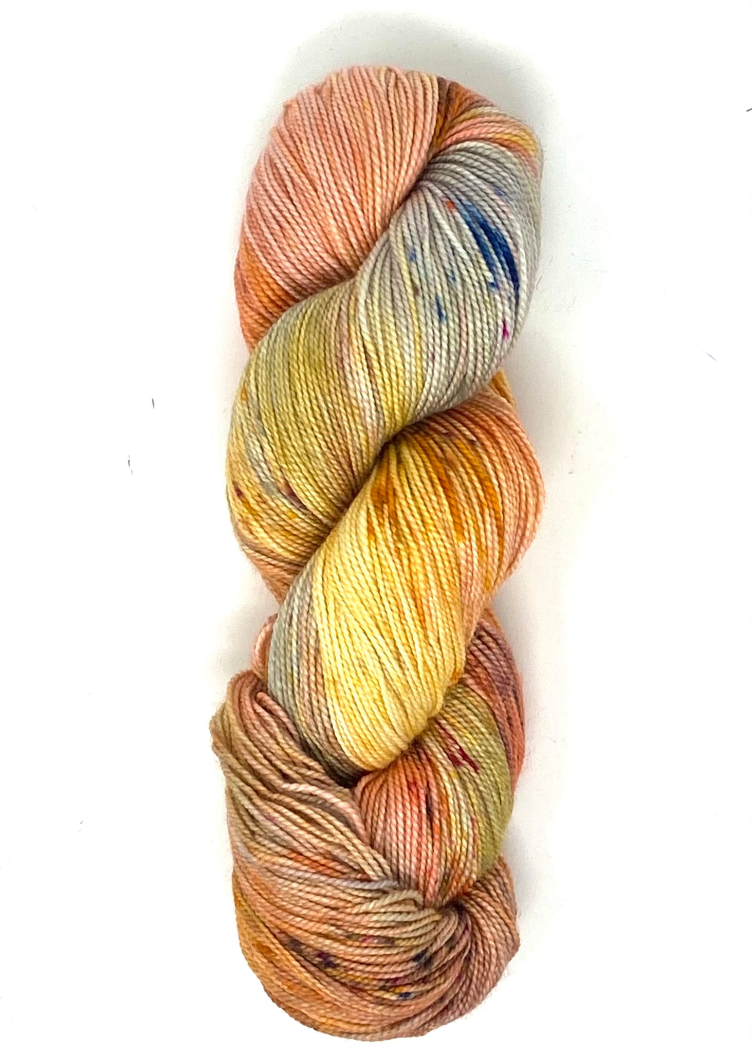 Part of the rhythm series, Baah Yarn La Jolla Here' Comes The Sun is a fingering weight yarn that is hand painted in Southern California. This color pairs beautifully with Silver Lady.