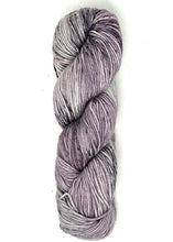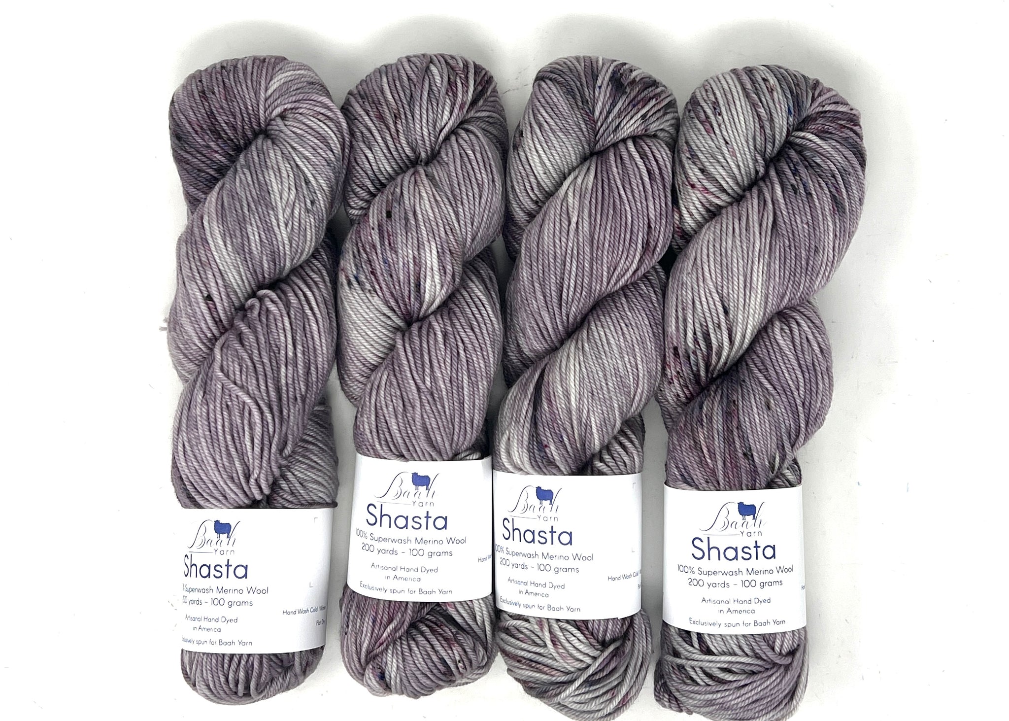 Parlez Vous Baah Yarn Shasta is a worsted weight yarn that is hand painted in Las Vegas. This color has beautiful mix of grey and lavender.