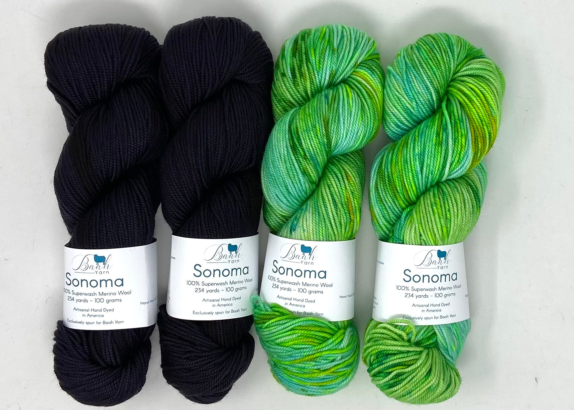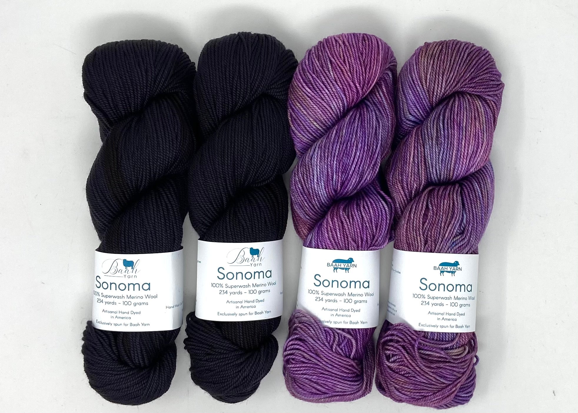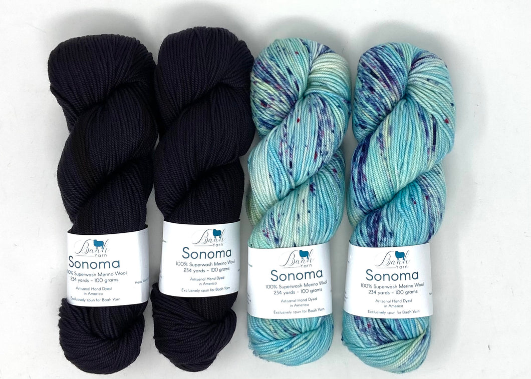 This kit was put together using Baah Yarn Sonoma. A hand dyed yarn made from 100% superwash merino wool is a joy to knit with!