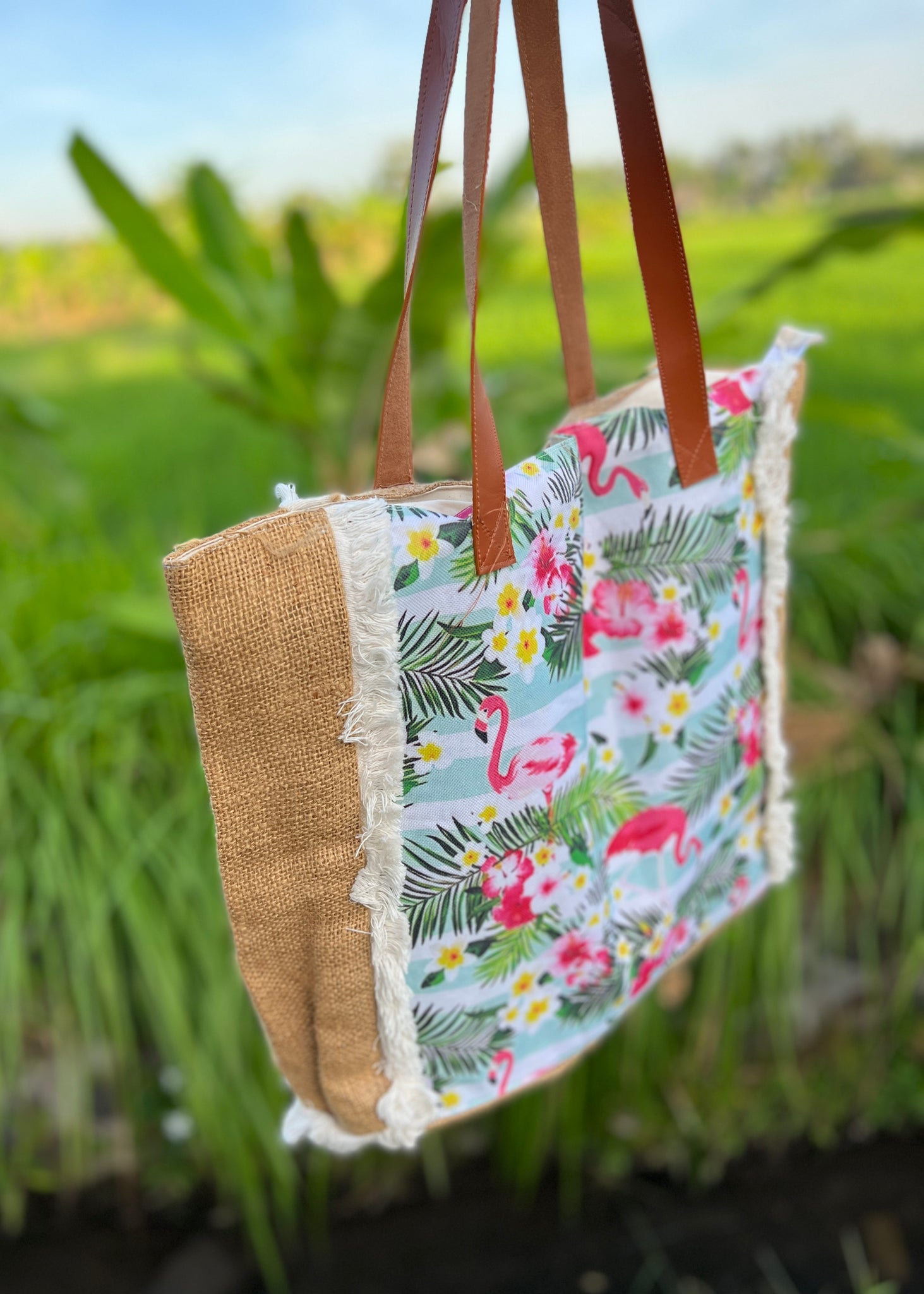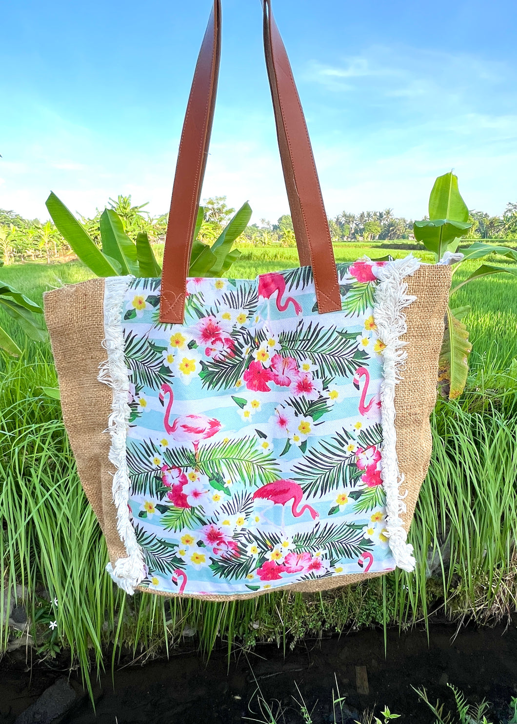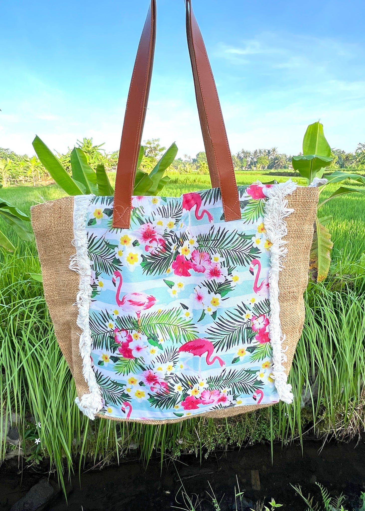 This large bag features a flamingo print. It has a zipper on top to close the bag and one inside pocket. Each bag was hand made in Bali using natural materials.