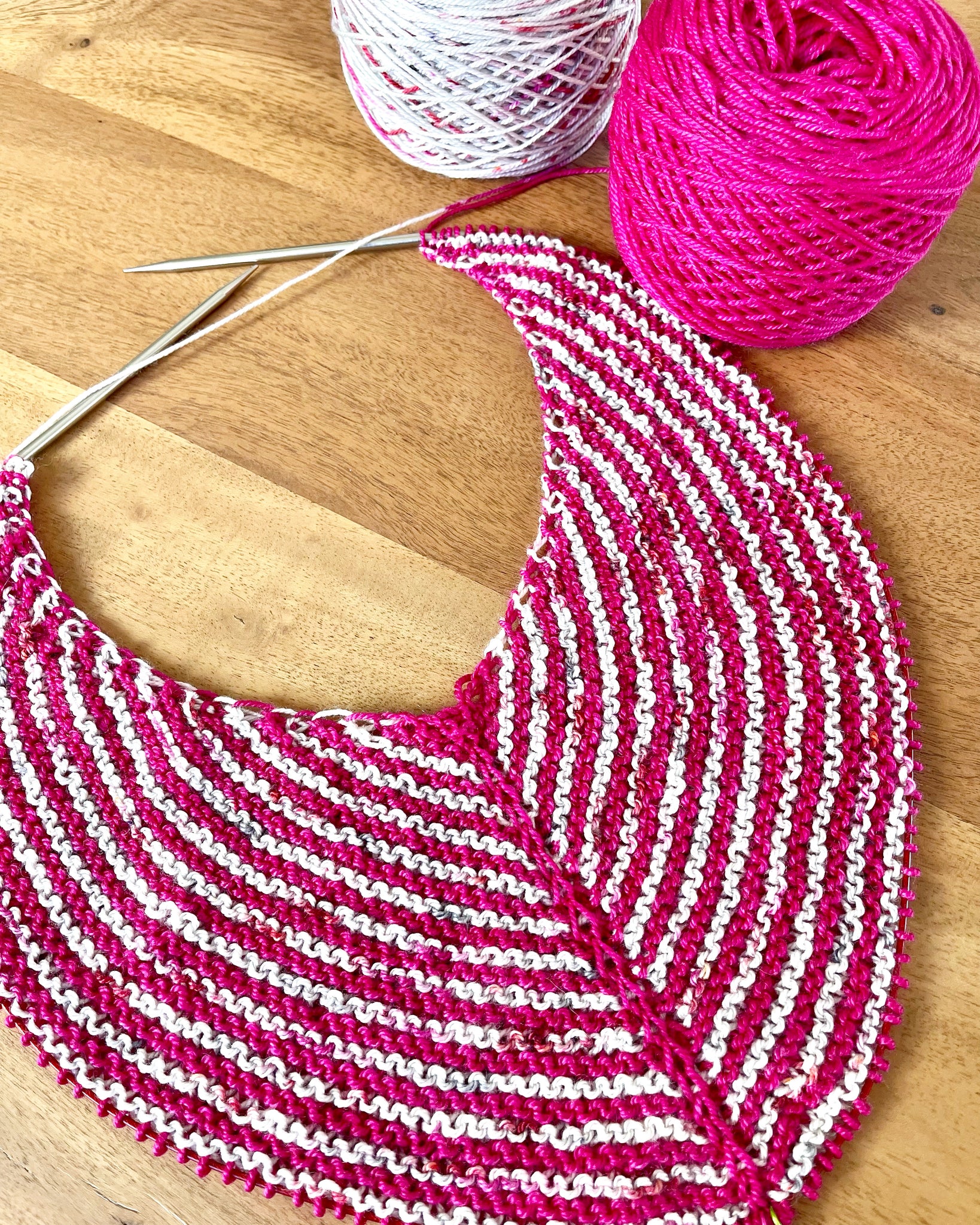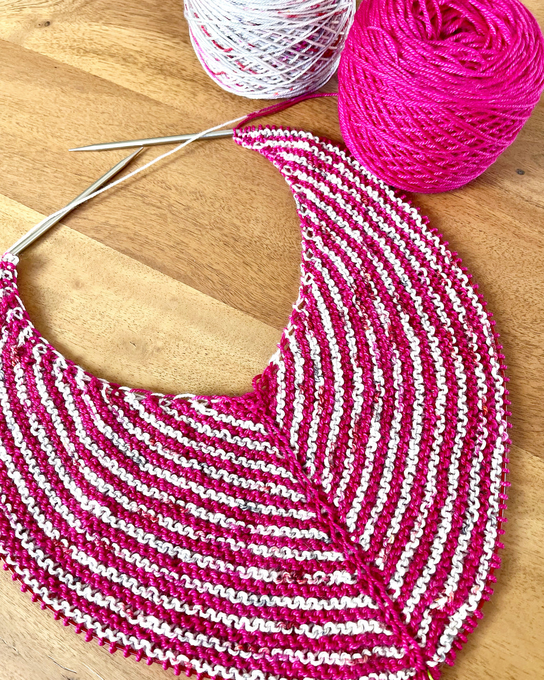 This fun shawl pattern has a beautiful stripe design. This kit uses 4 skeins total of Baah Yarn Shasta. Each skein is 200 yards and is made from 100% superwash merino wool.