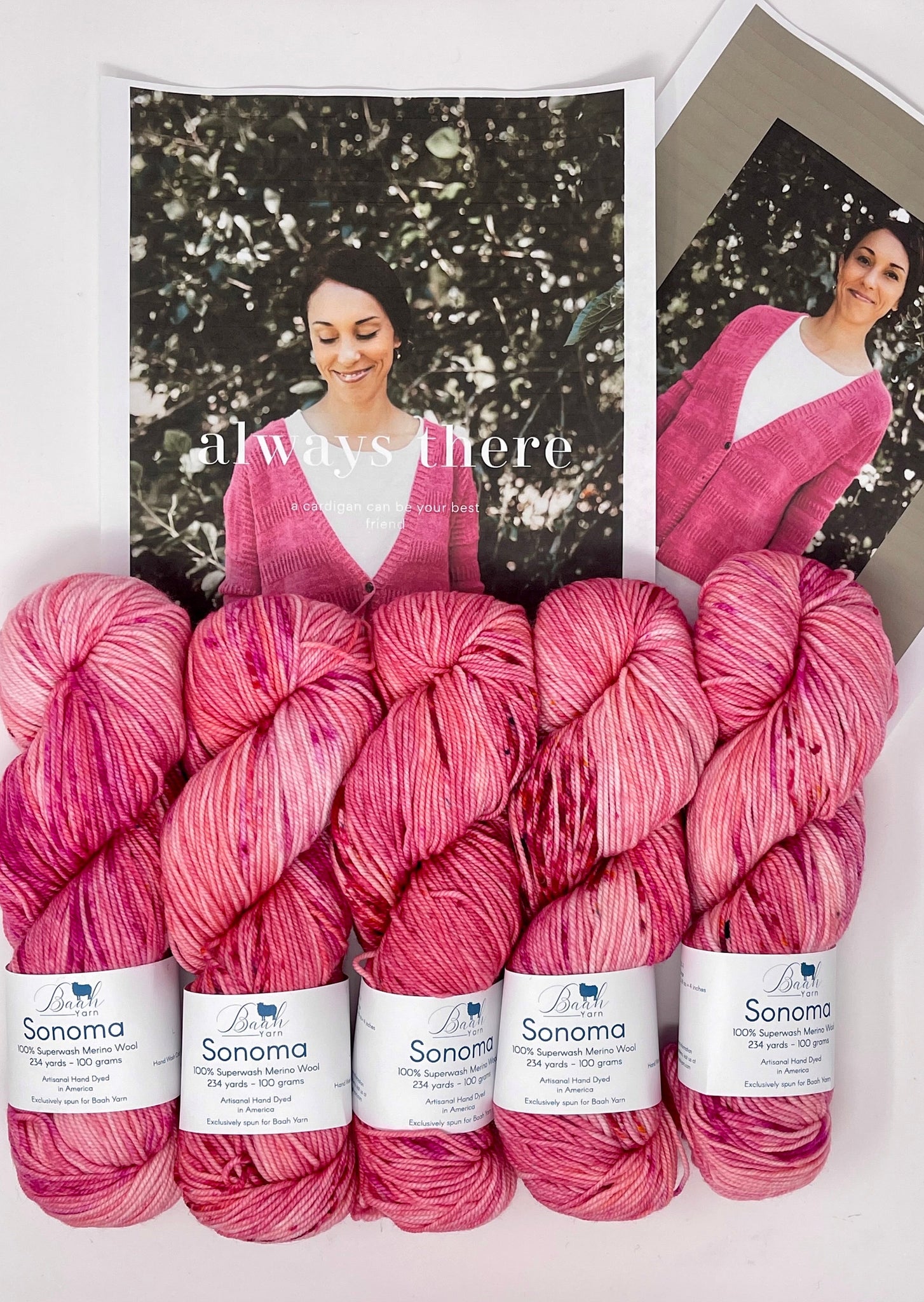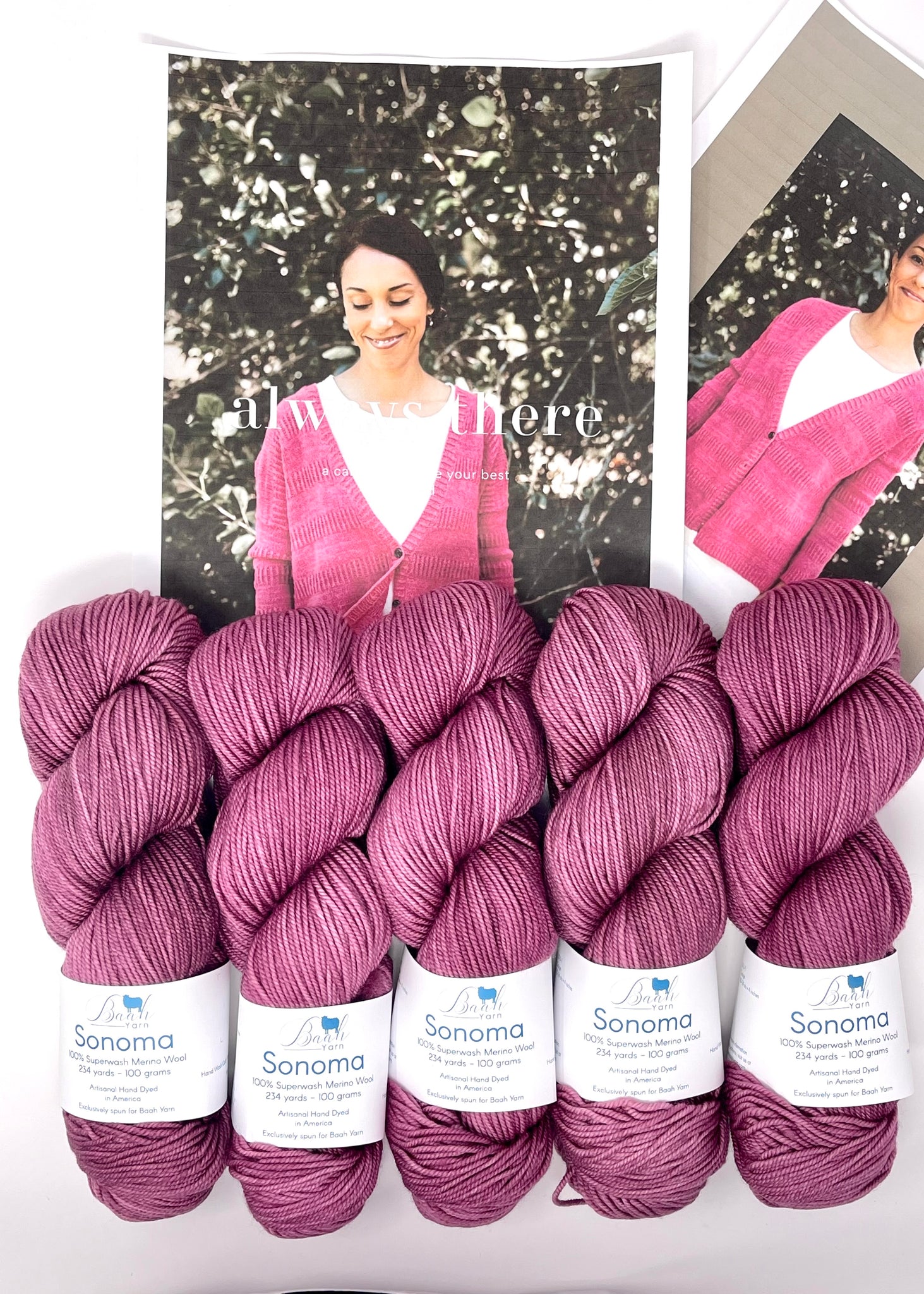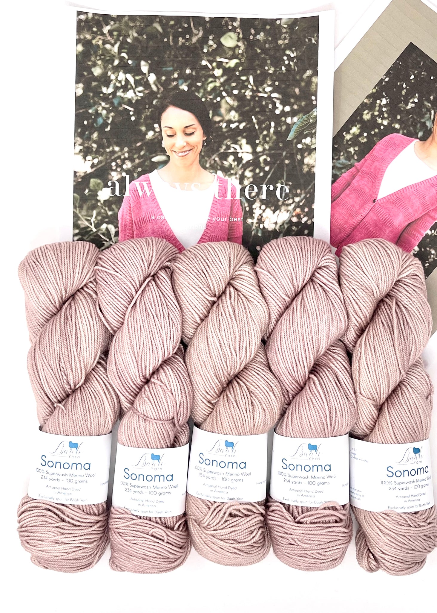 This kit was put together with Baah Yarn Sonoma. This hand dyed yarn is DK weight and is a joy to knit with! Each skein is 234 yards.