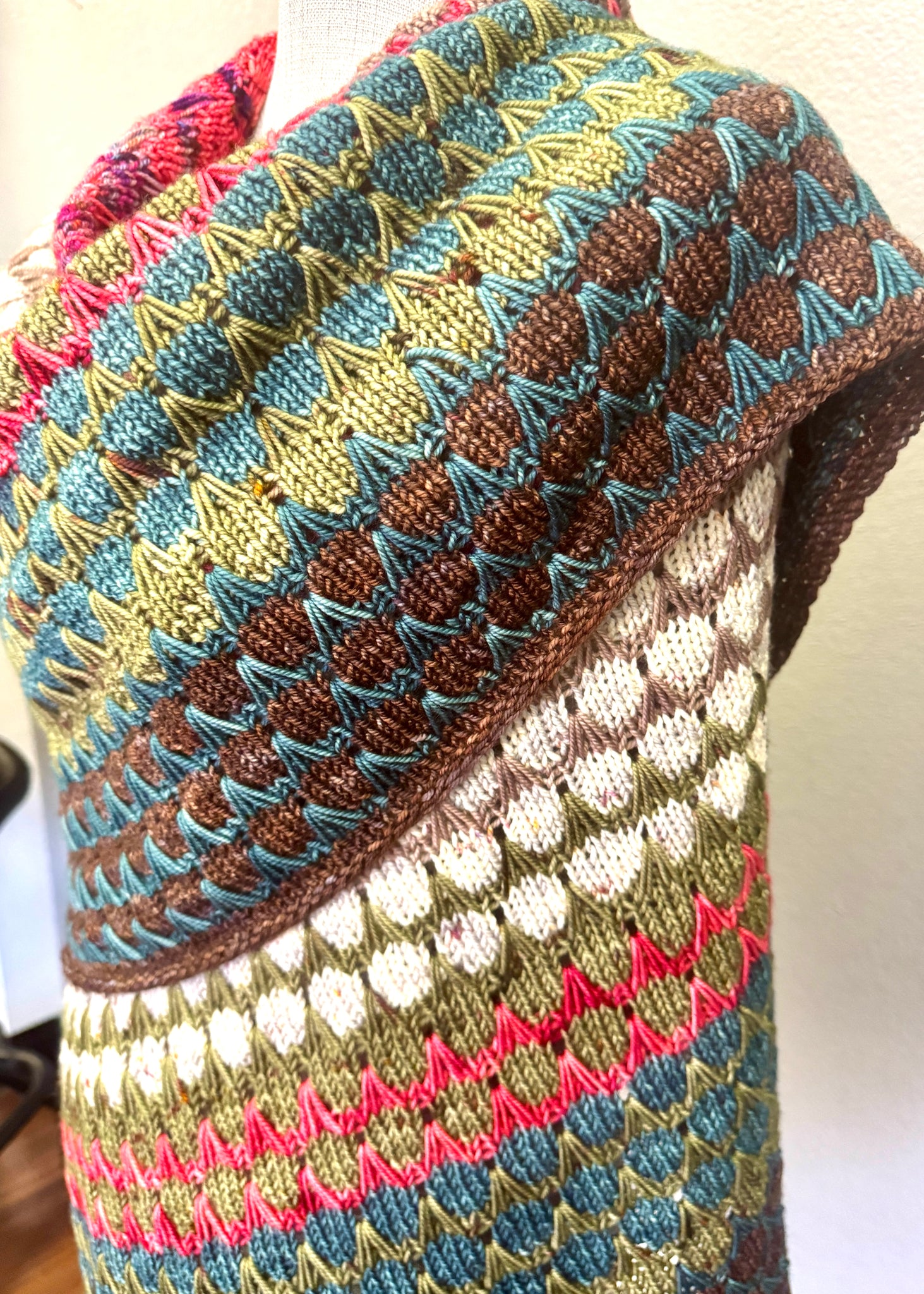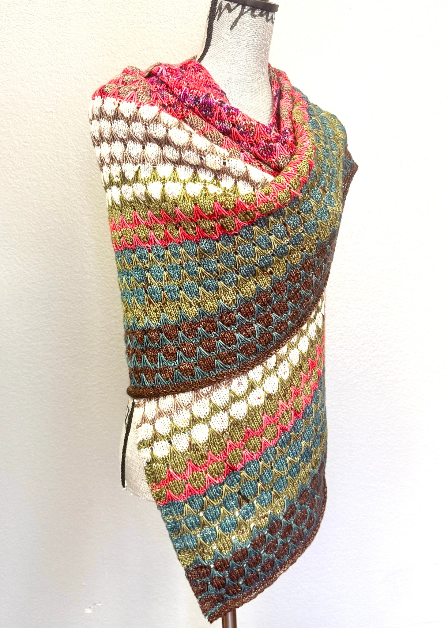 This fun shawl knit comes with 8 skeins of Baah Yarn Sonoma DK weight yarn. Each skein is about 235 yards. This large wrap is such a fun knit with all the different colors.