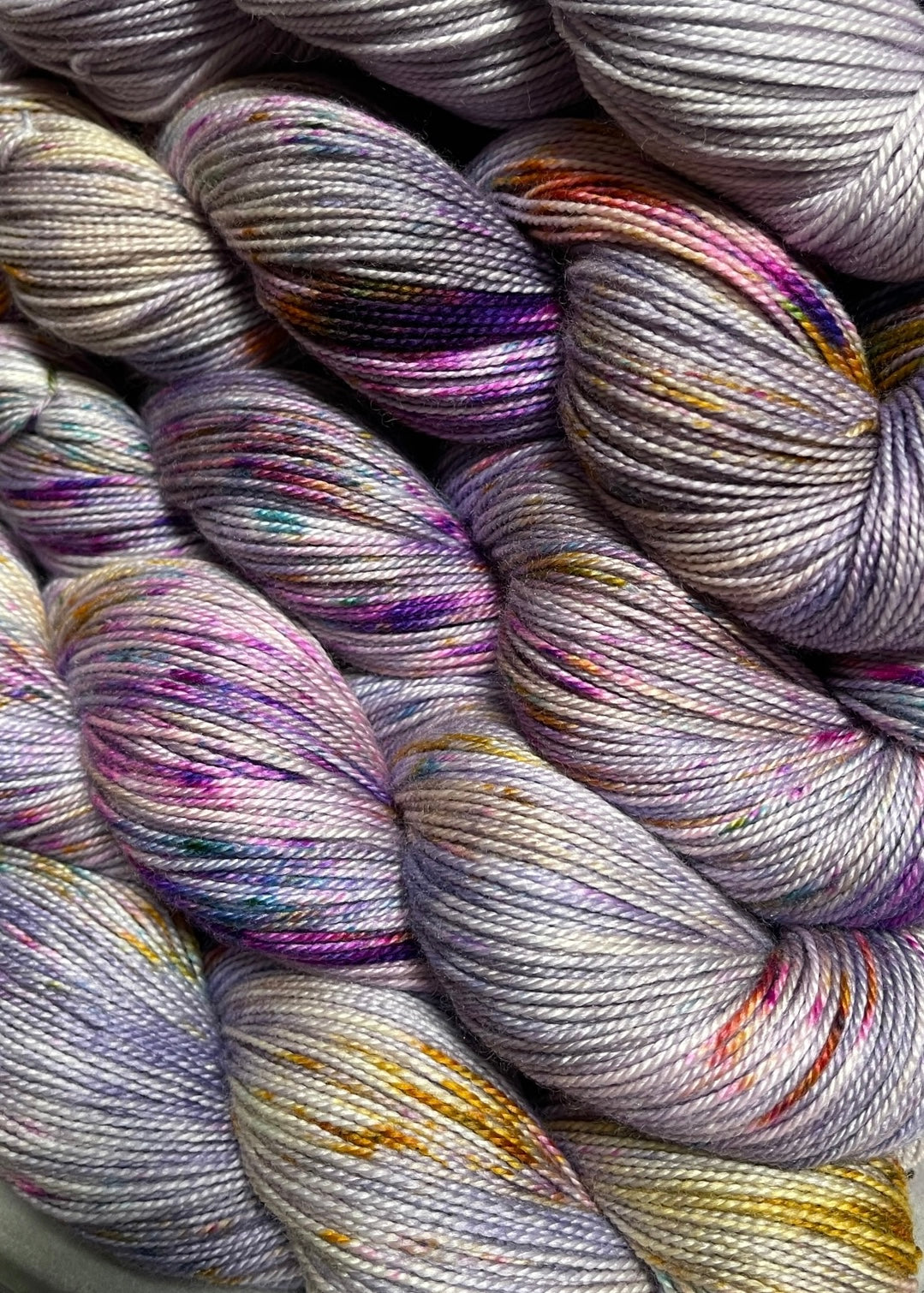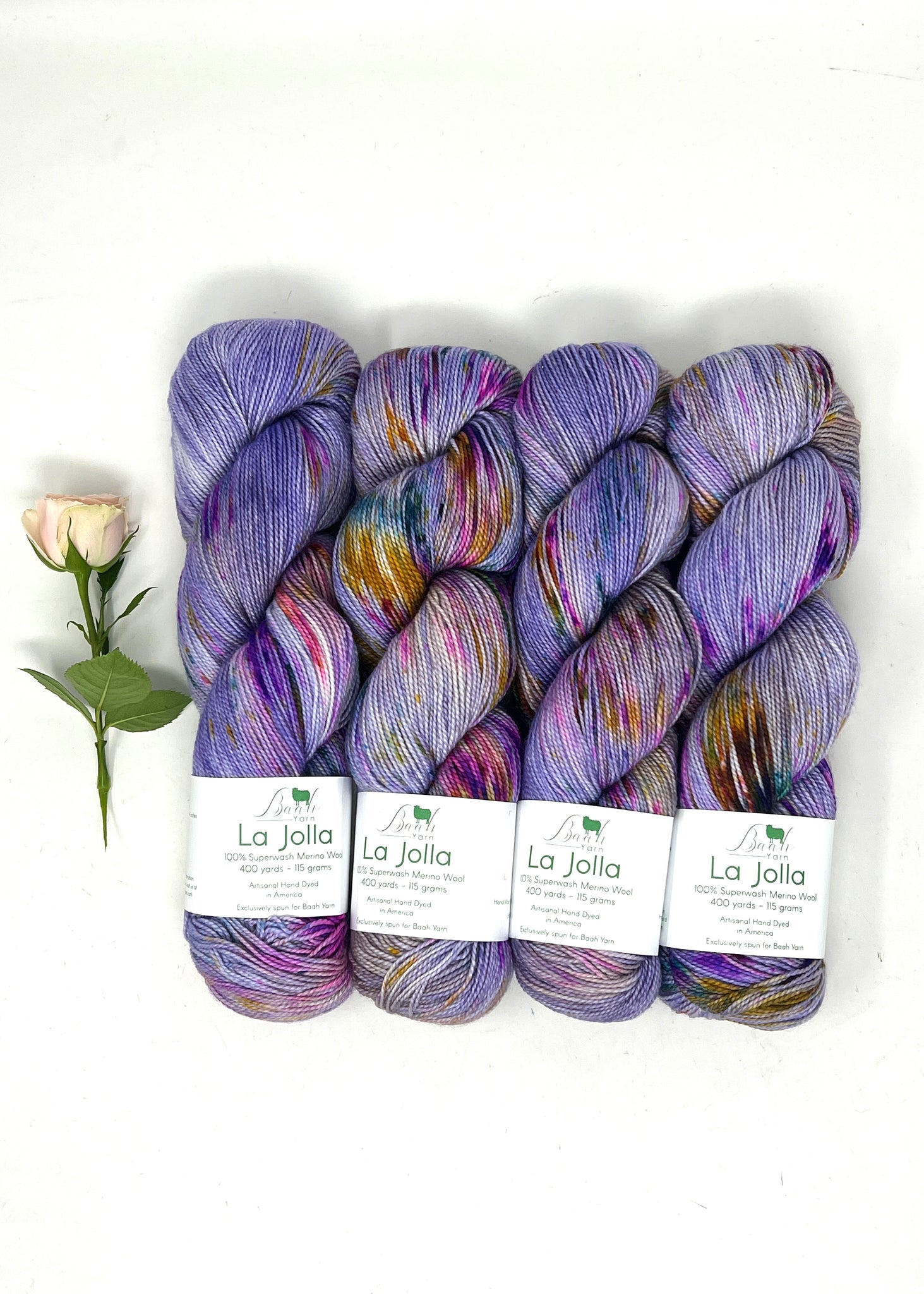 This special lys day colorway is handyed by Baah Yarn. It comes with a Ravelry coupon code for a 3 skein shawl pattern gift.