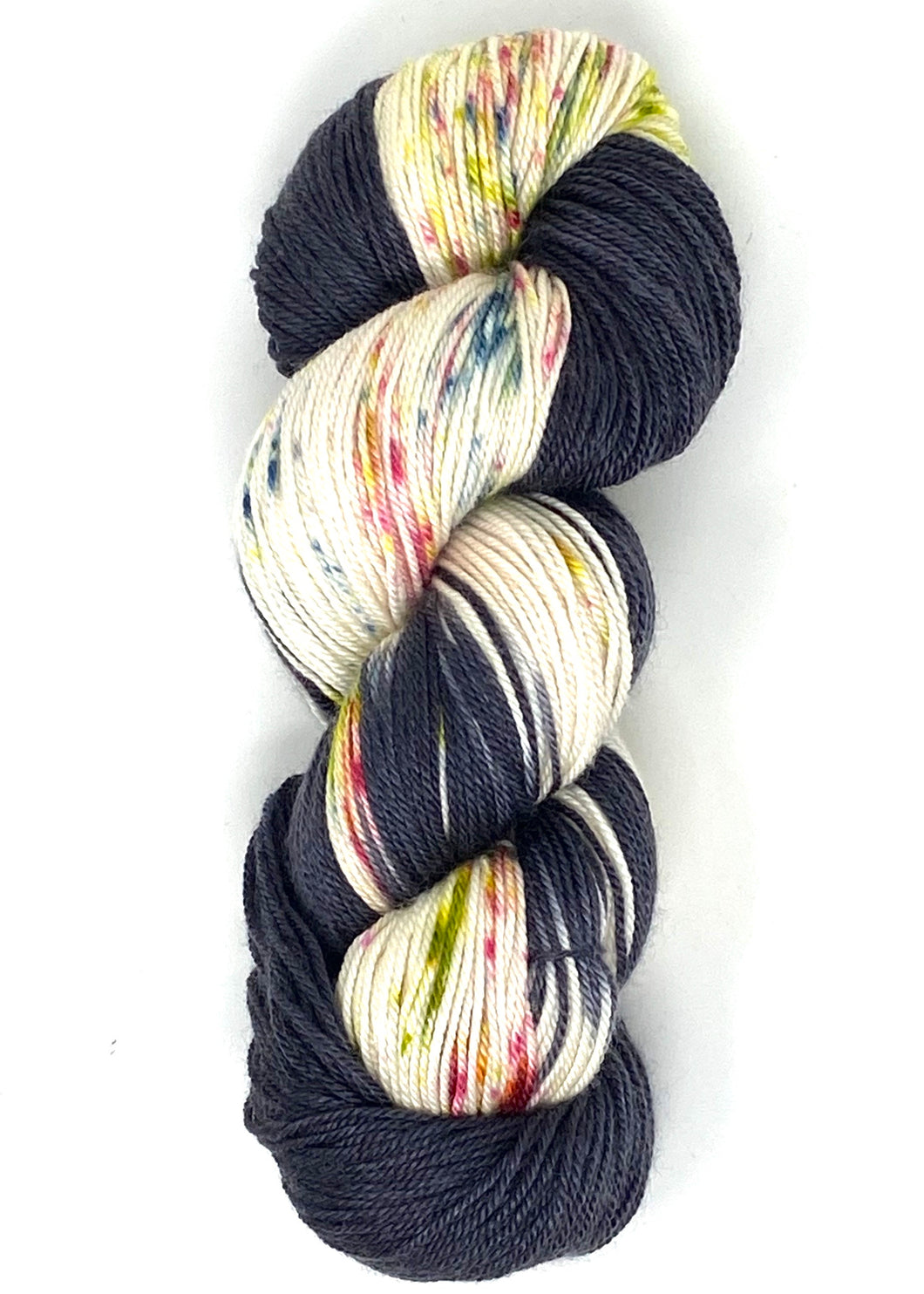 Make My Heart Sing from Baah Yarn is a Dipped and Dappled color that features black with pink, yellow, blue, and hints of green speckles. The Dipped and Dappled series is a fun and unique yarn to knit with.