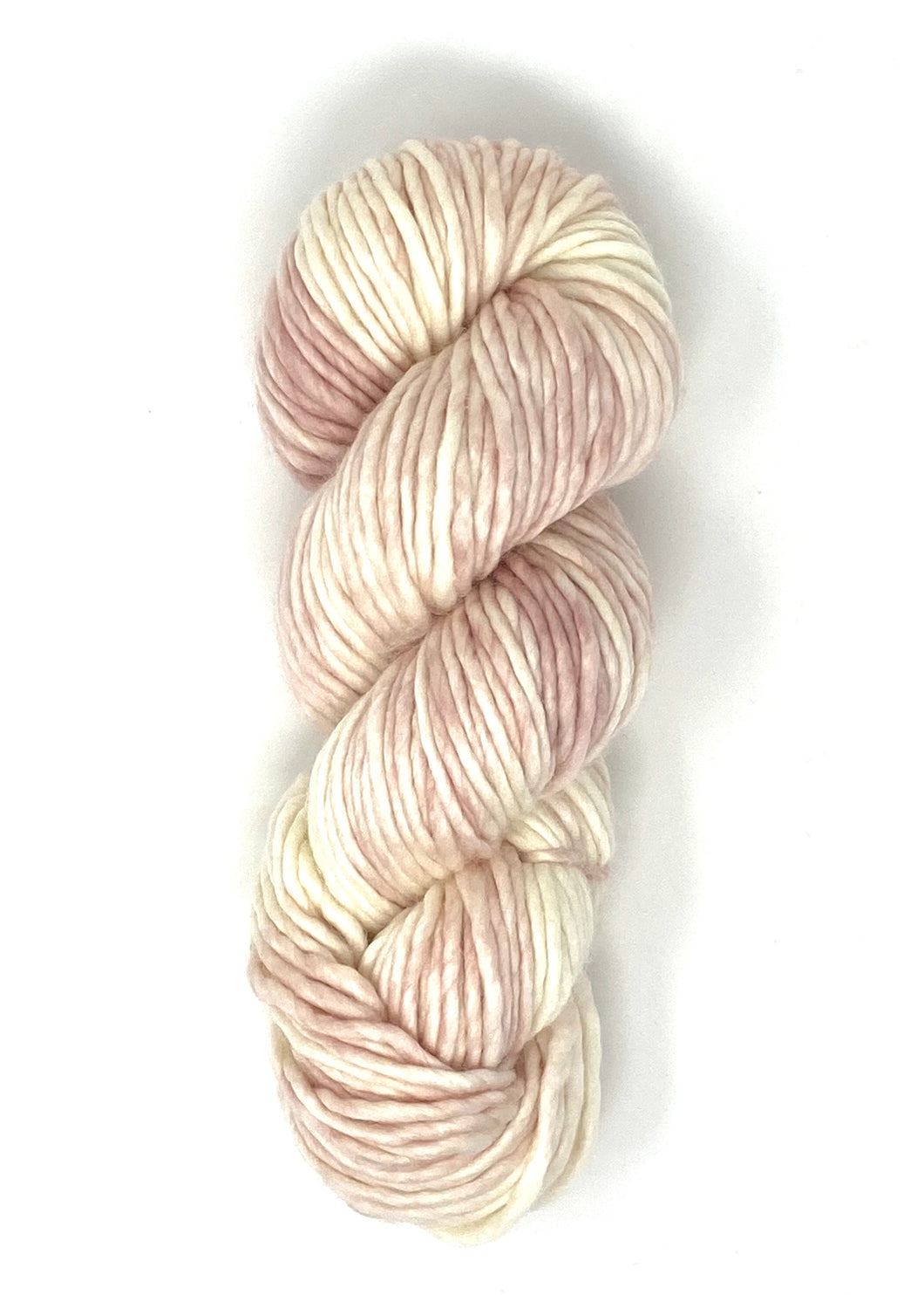Baah Yarn is hand-dyed in the USA. The Sequoia yarn line is made from 100% superwash merino wool. Baah Yarn Sequoia Mauve-lous has a gorgeous white base with light hints of mauve.