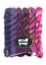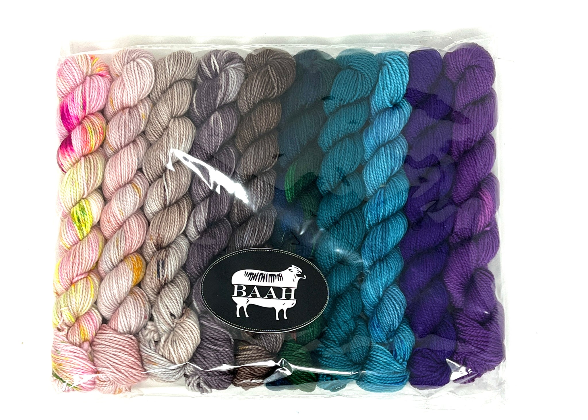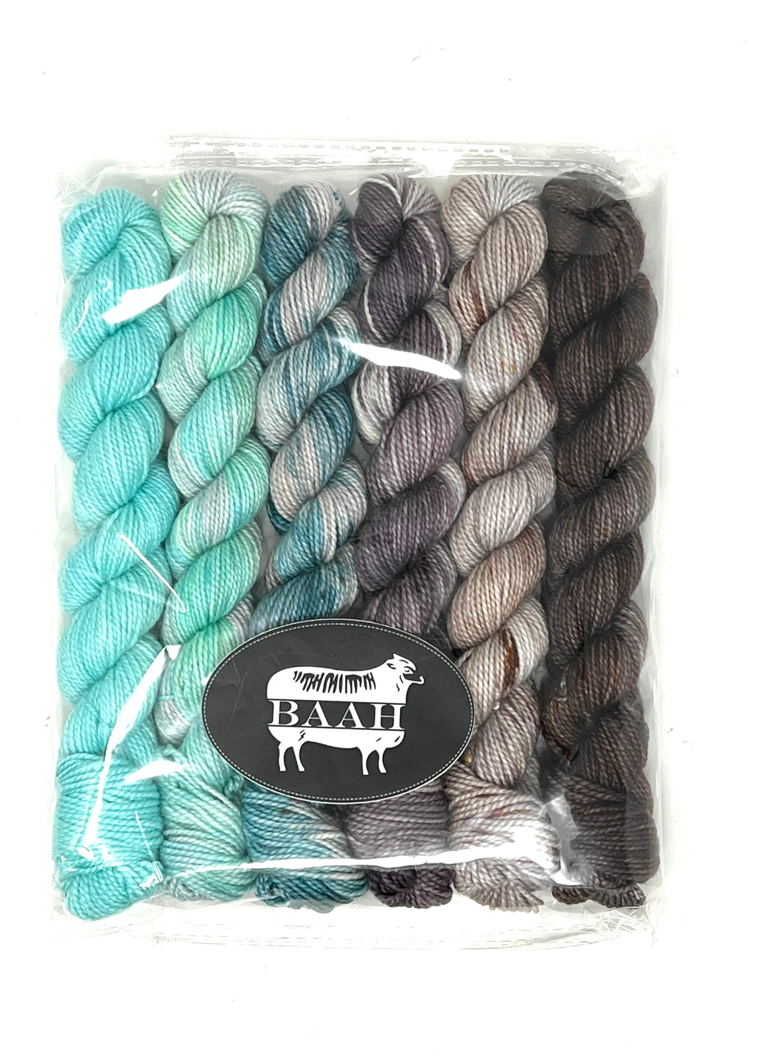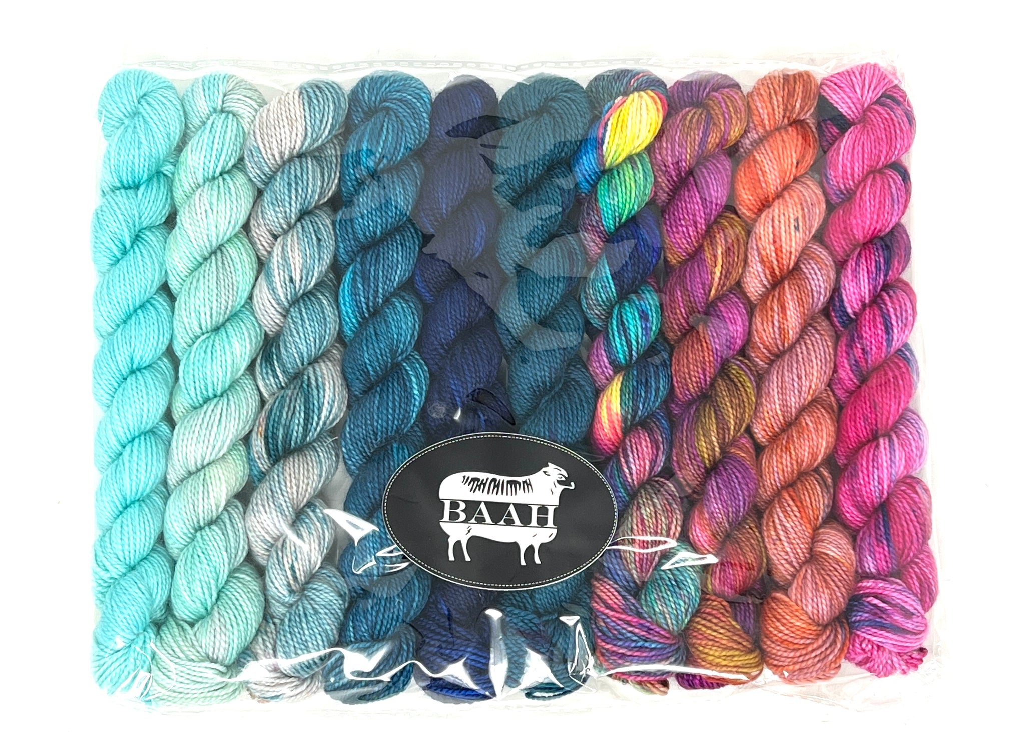 Your choice of a 6 or 10 pack one of a kind mini skeins of yarn is hand dyed by Baah Yarn. Mini skeins are in the La Jolla yarn base.