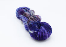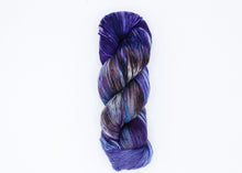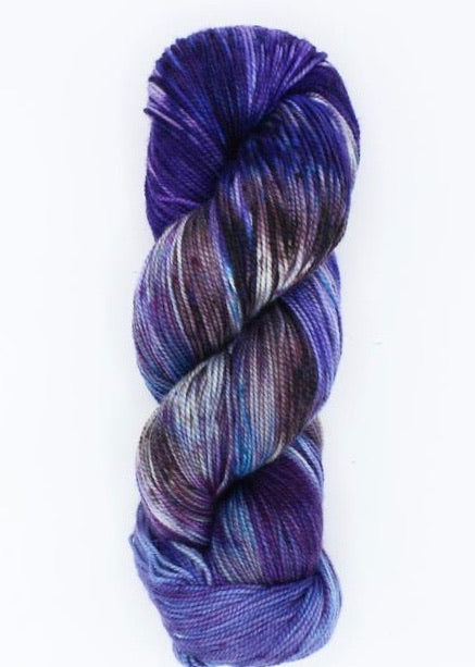 Baah Yarn La Jolla is a fingering weight yarn made from 100% superwash merino wool 400 yards. Night Owl features a blend of light and dark purple & blue shades with hints of white.