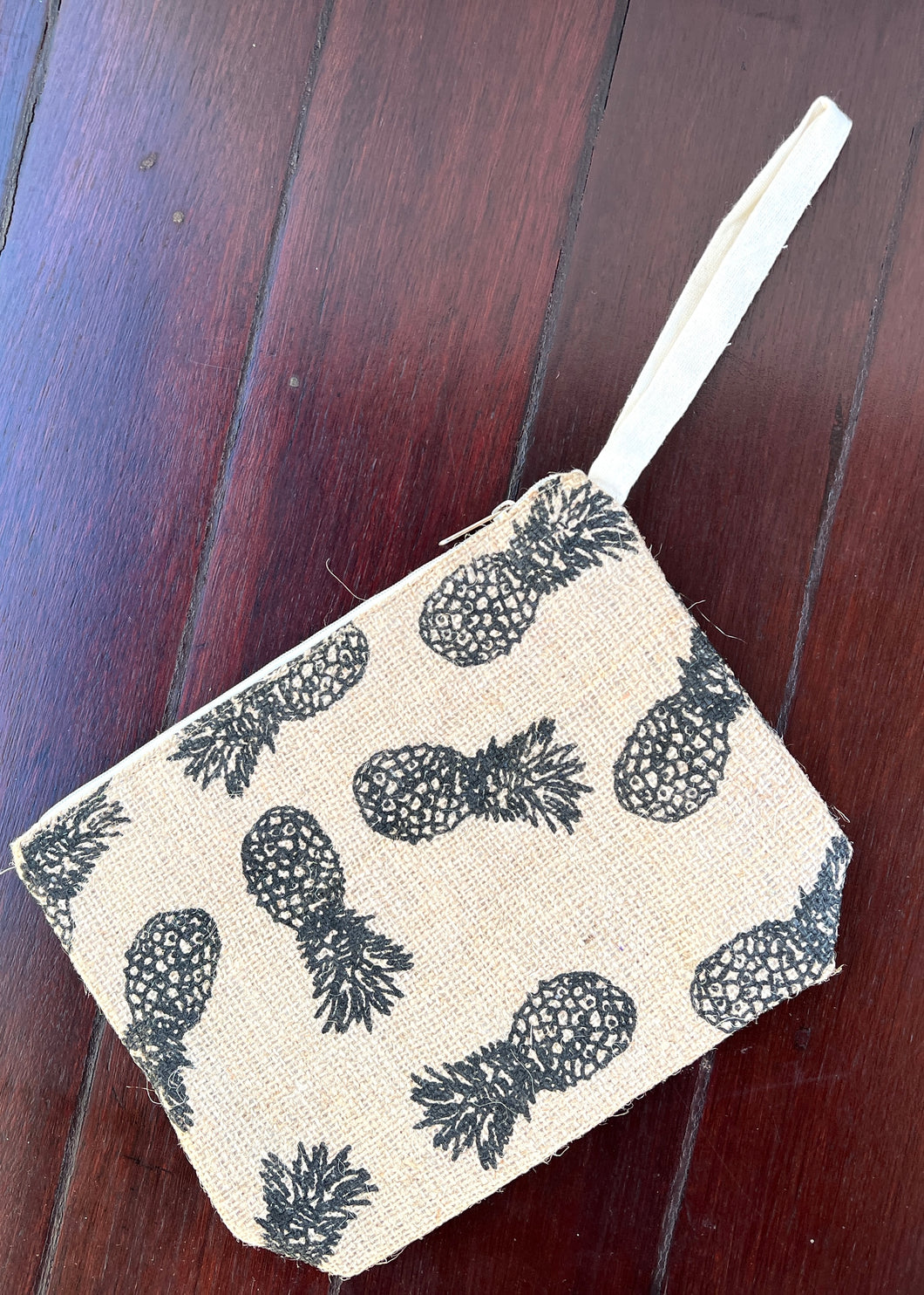 This wristlet features a black pineapple print on raffia. It has a zipper on top and is great for storing project accessories, knitting needles, and small projects. Hand made in Bali using natural materials.