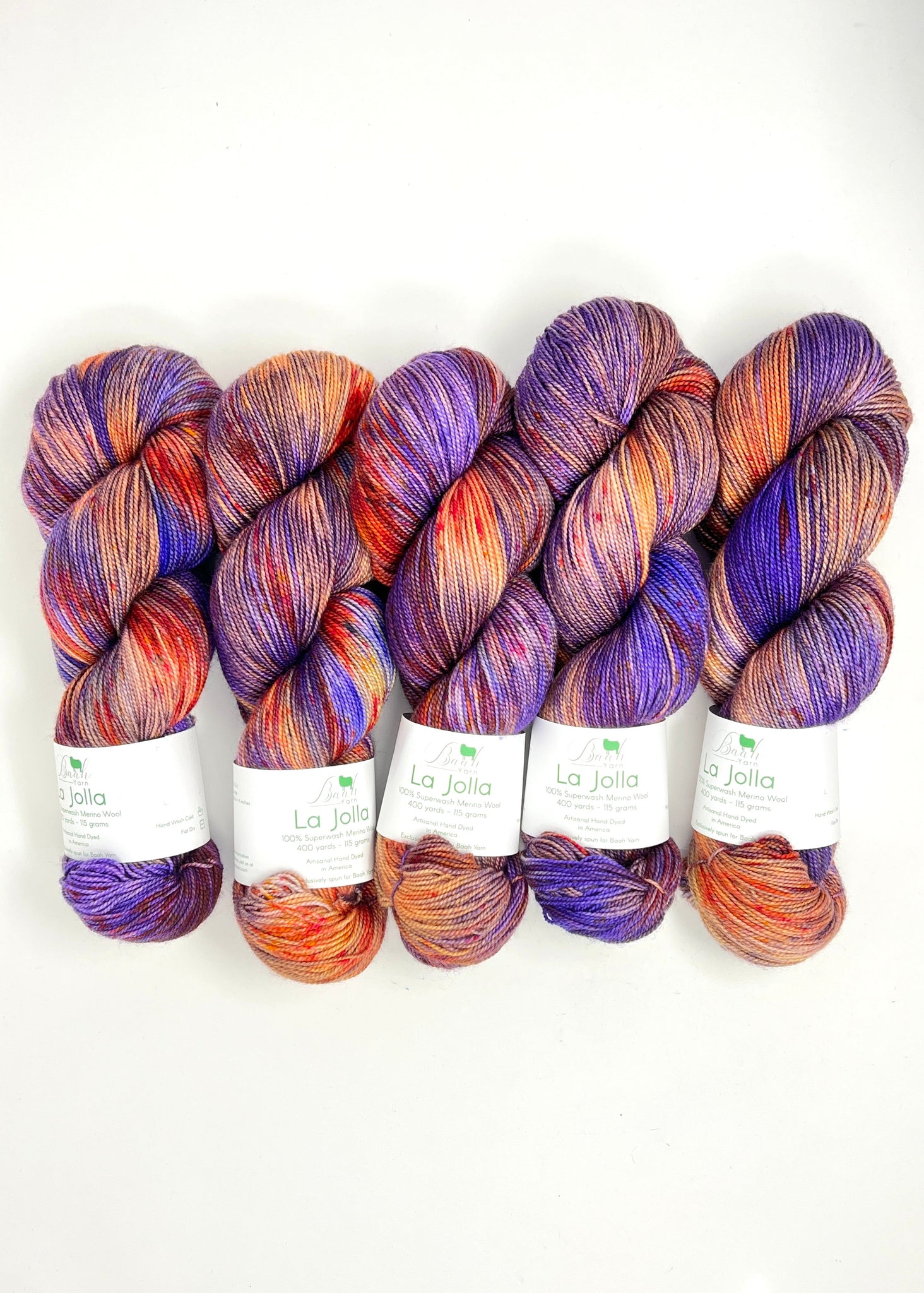 Baah Yarn La Jolla is hand-painted. Each skein is made from 100% superwash merino wool.