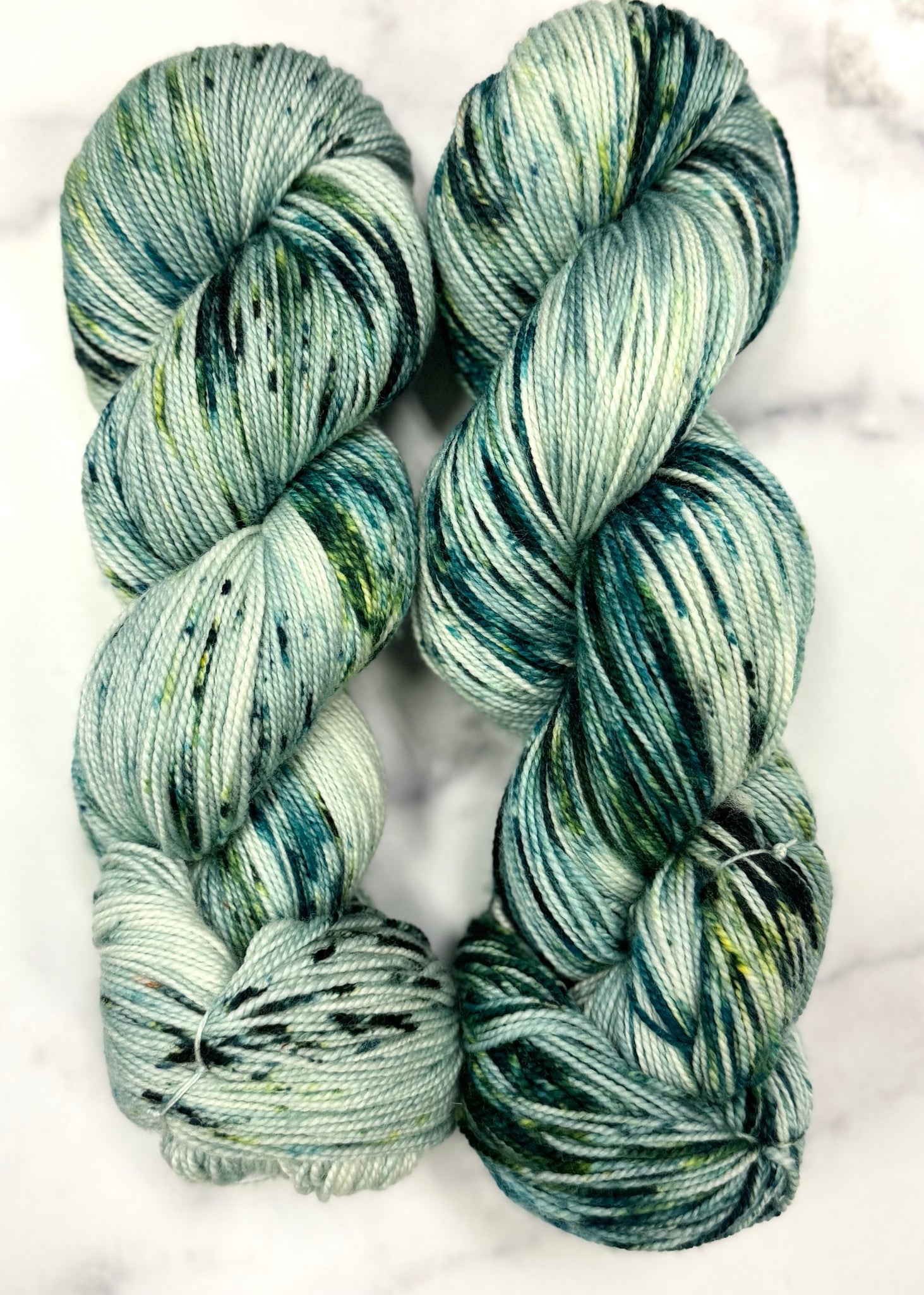 Baah yarn Spring Has Sprung has a gorgeous blend of green, teal and hints of blue. This yarn color is available in all hand dyed yarn bases.