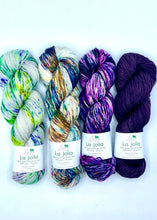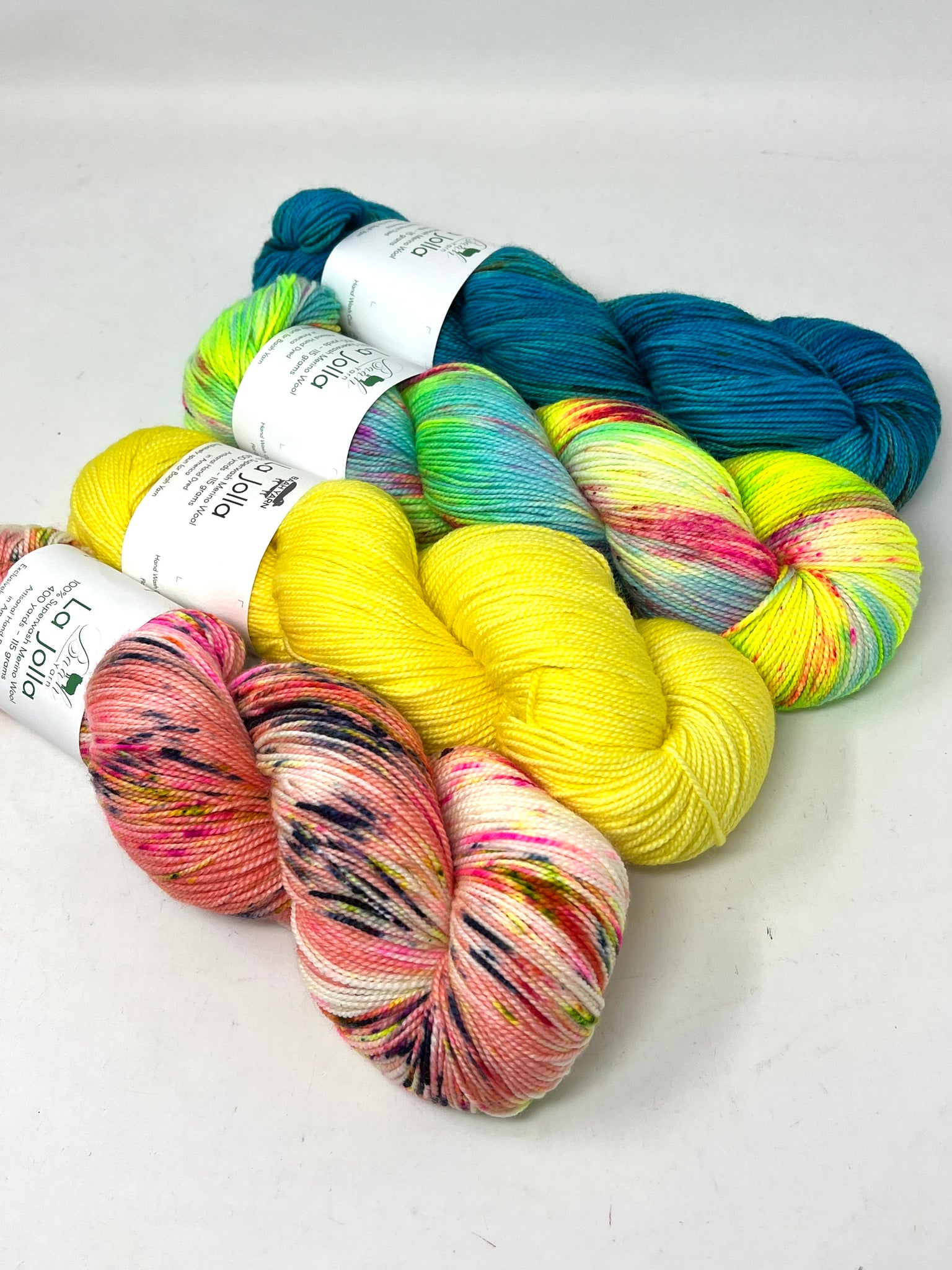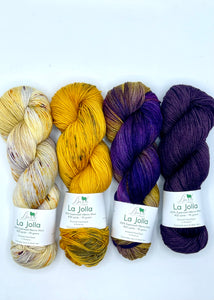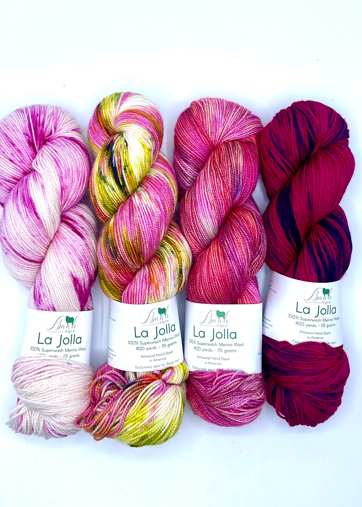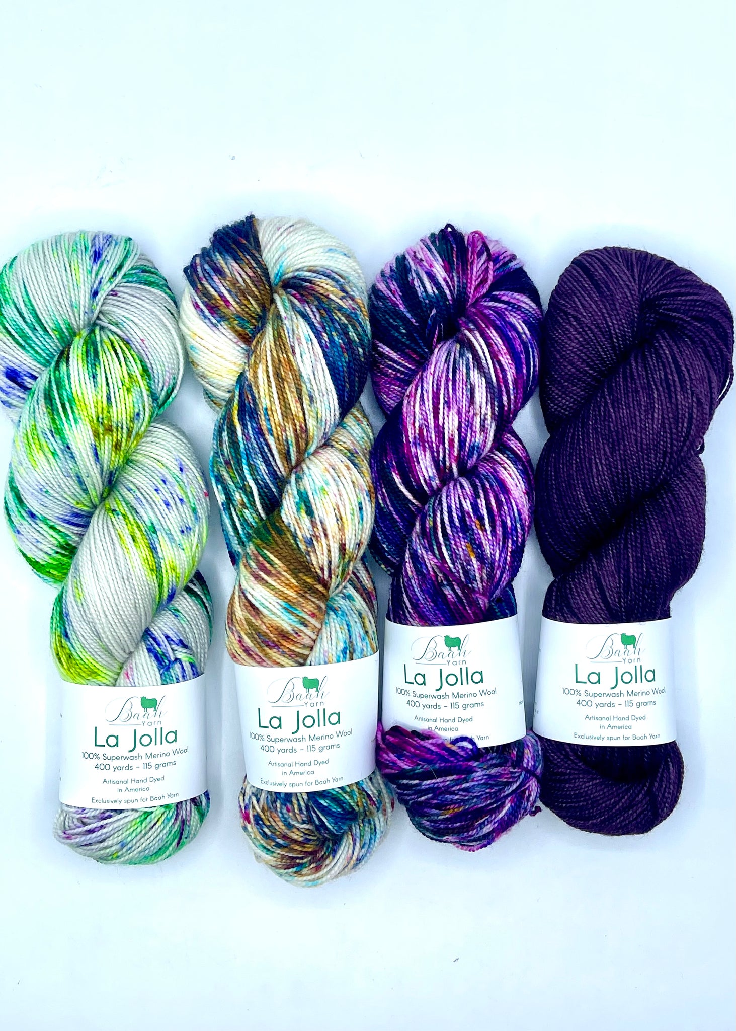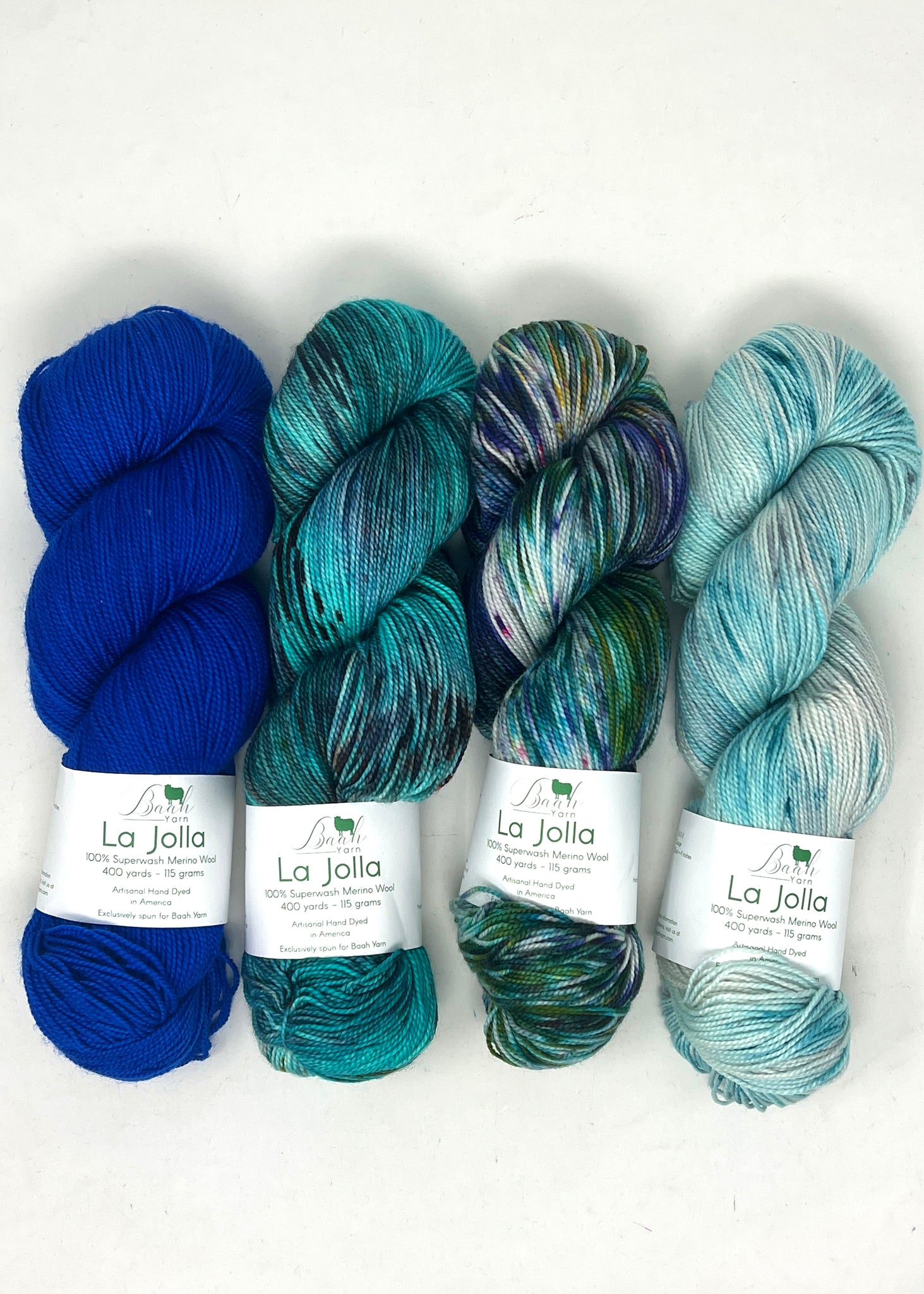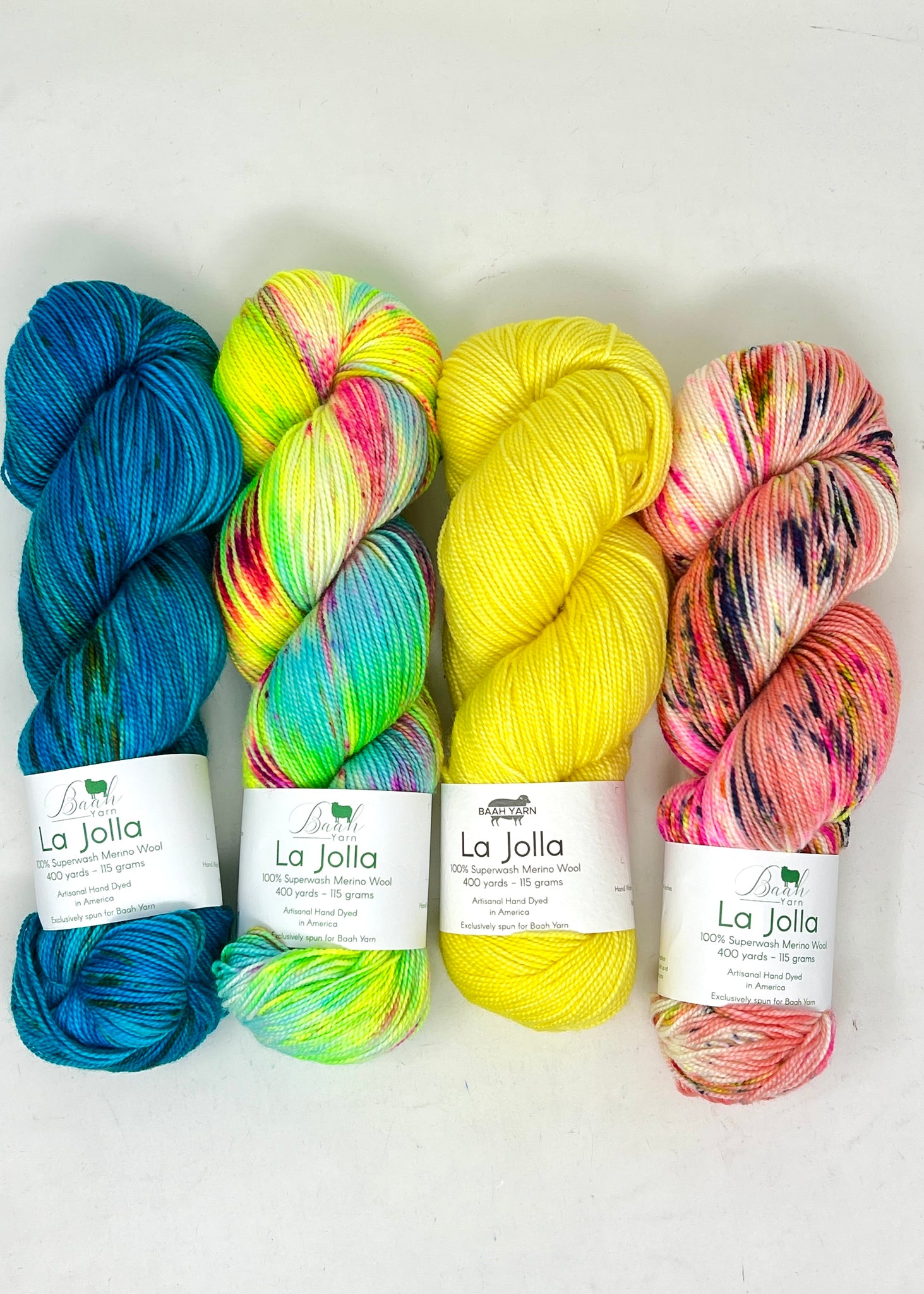 This fun Eyelet Burst shawl kit comes with 4 skeins of Baah yarn La Jolla. It is fingering weight and made of 100% superwash merino wool. Each skein is 400 yards.