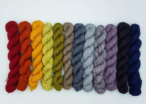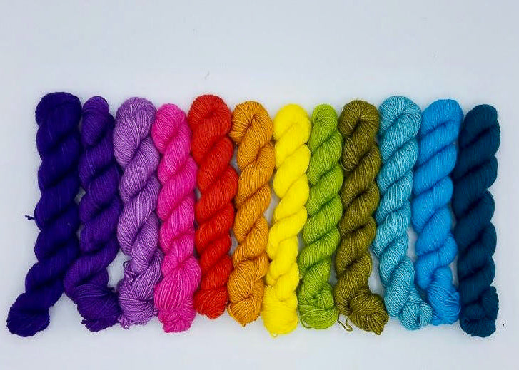 Using Baah Yarn La Jolla, this fun 12 skein kit was made for The Great British Baking Shawl MKAL. La Jolla yarn is fingering weight and is made from 100% superwash merino wool (2 ply).