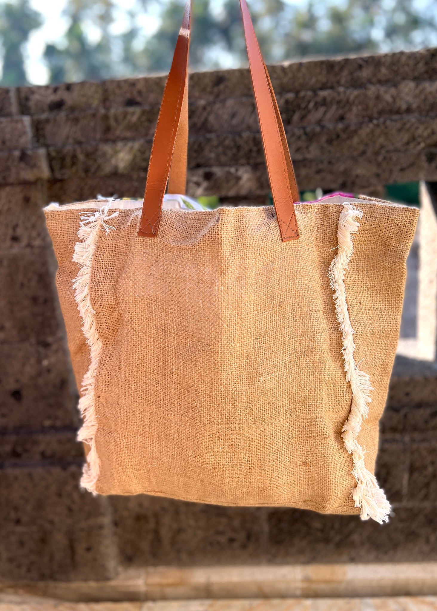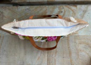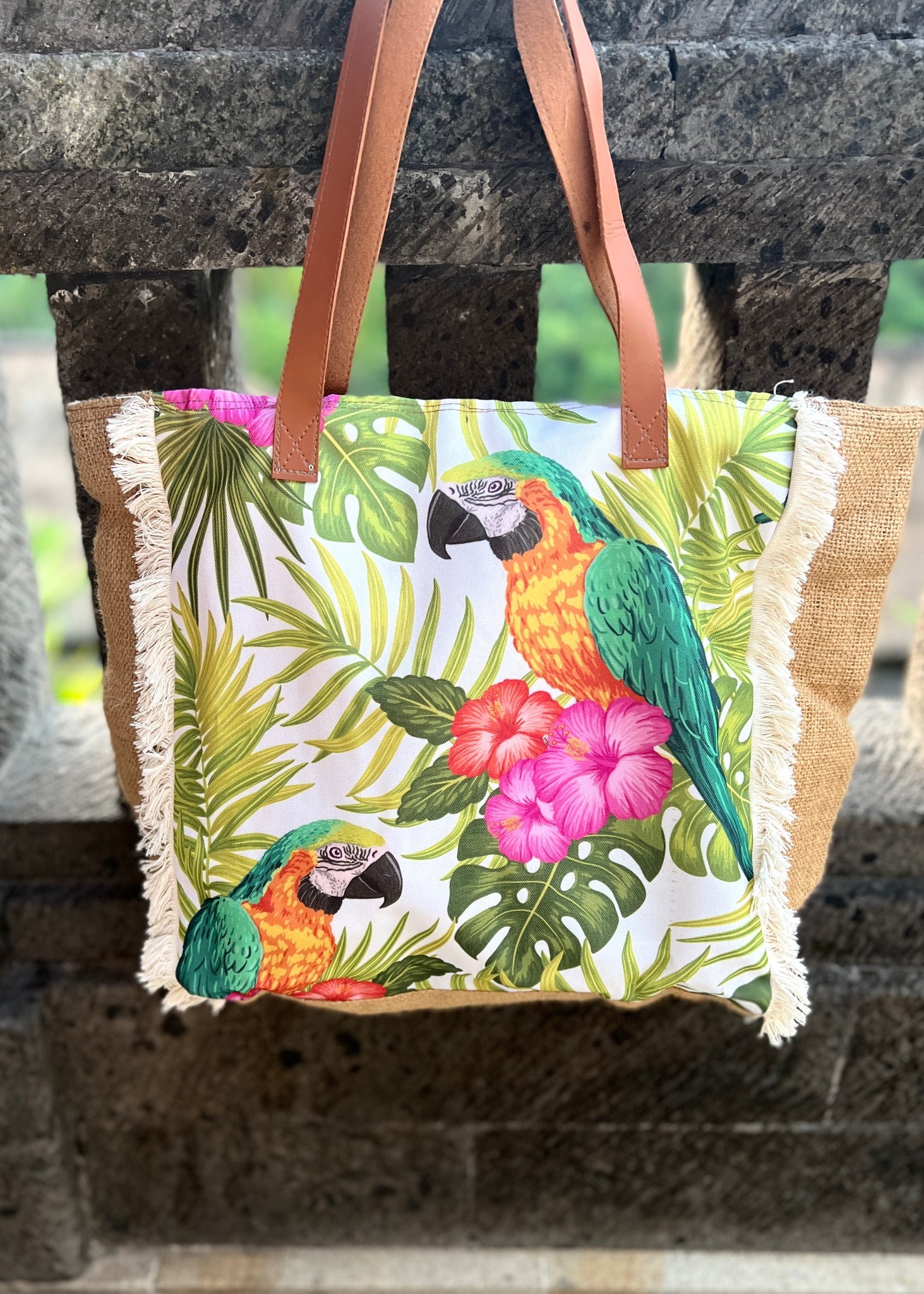 This large bag features a tropical bird and flower print. It has a zipper on top to close the bag and one inside pocket. Each bag was hand made in Bali using natural materials.
